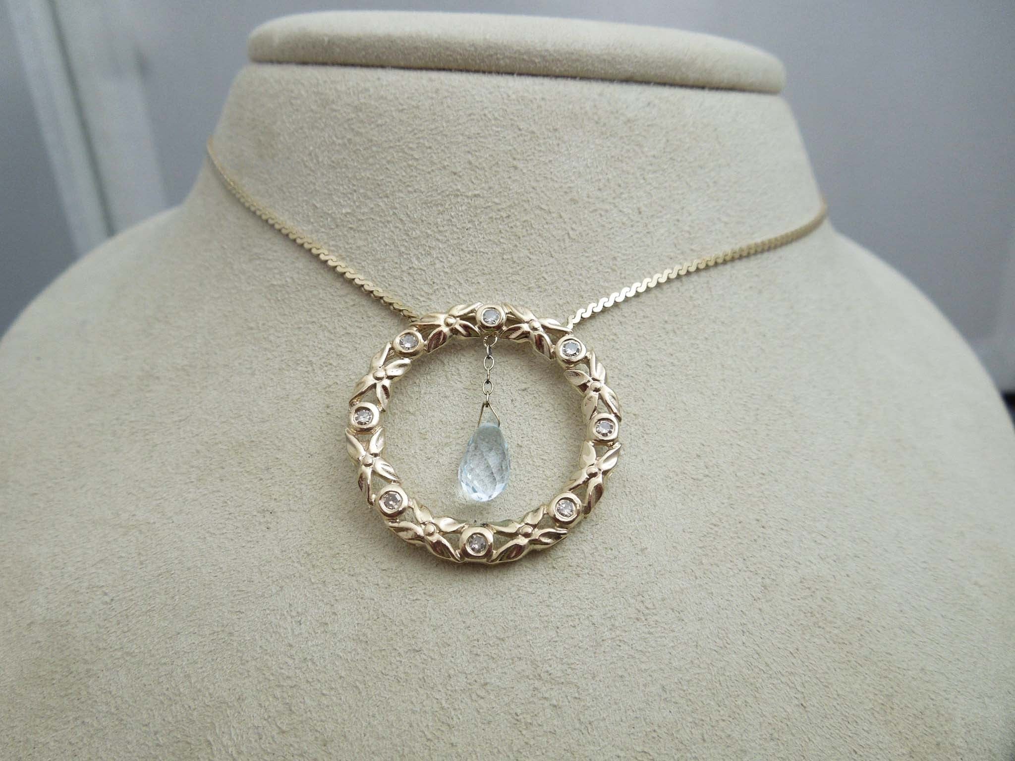 a634 Beautiful Vintage 14k Yellow Gold Circle Wreath with Diamonds and a Dangling Aquamarine Briolette