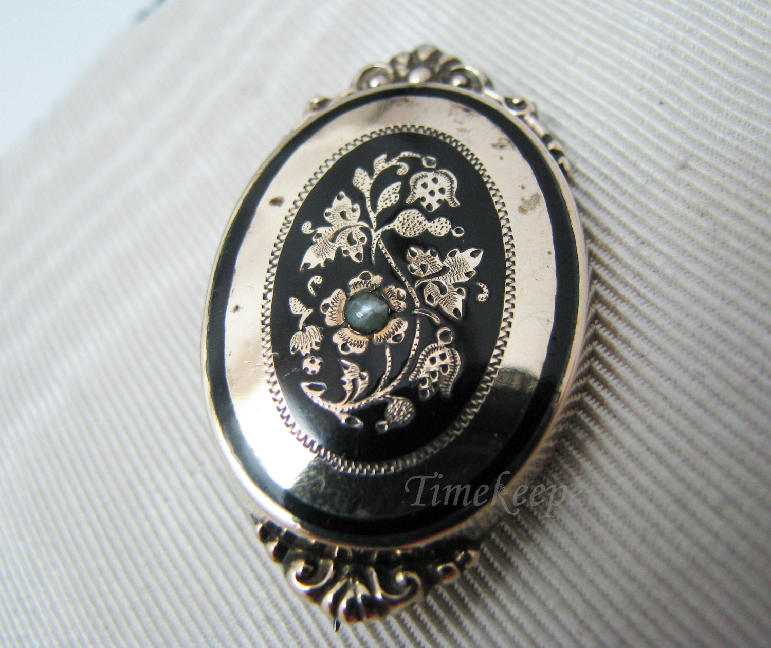 a692 Beautiful Gold Filled Brooch with Black Enamel and Seed Pearl