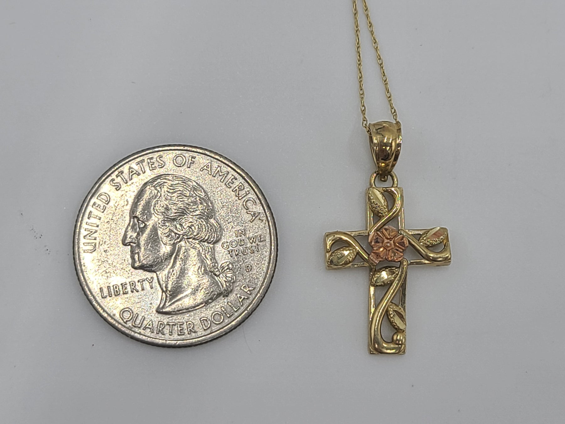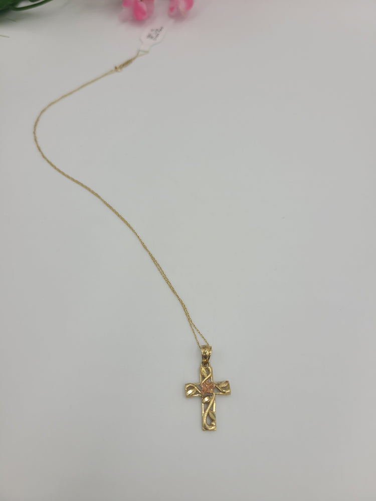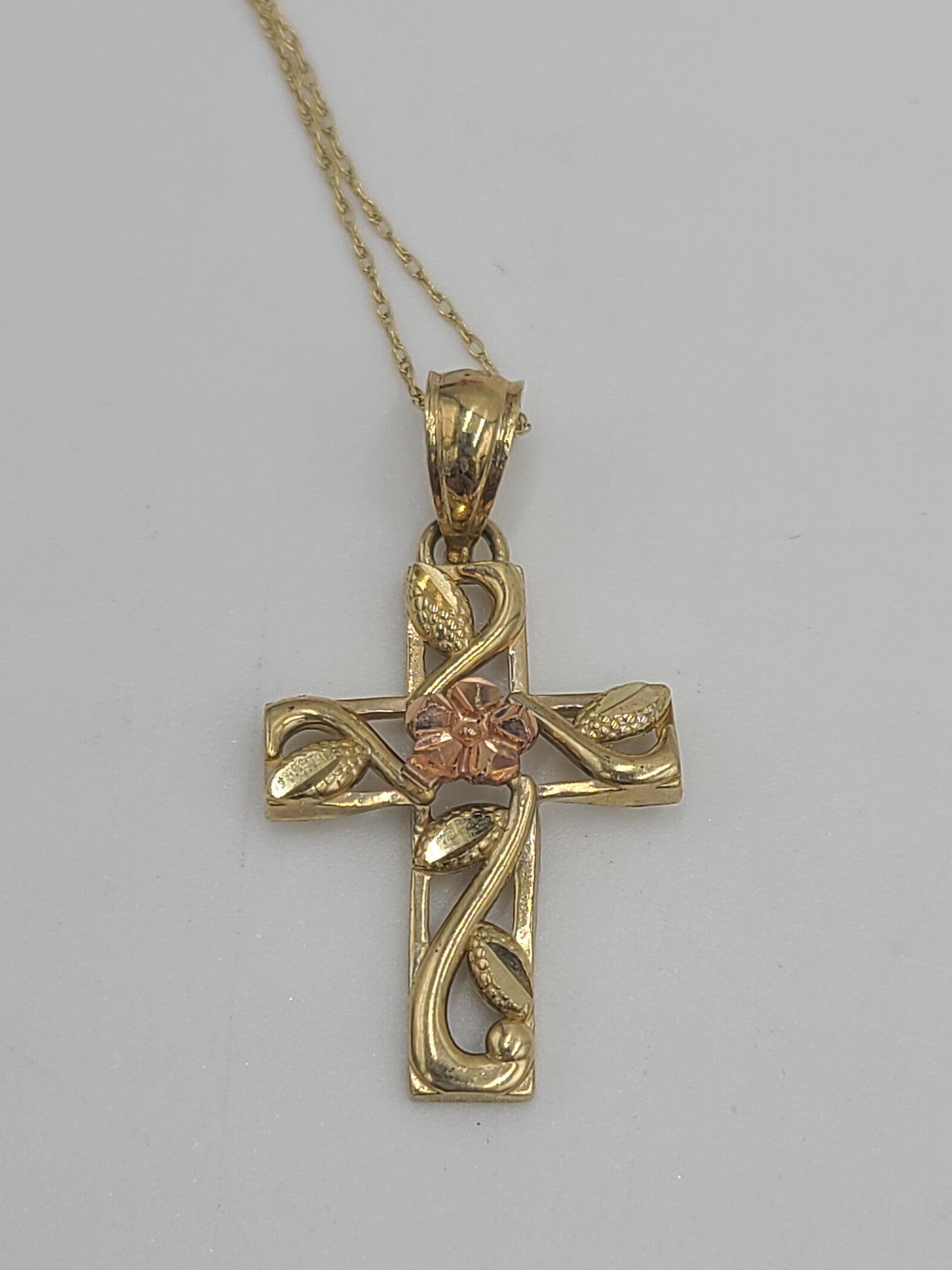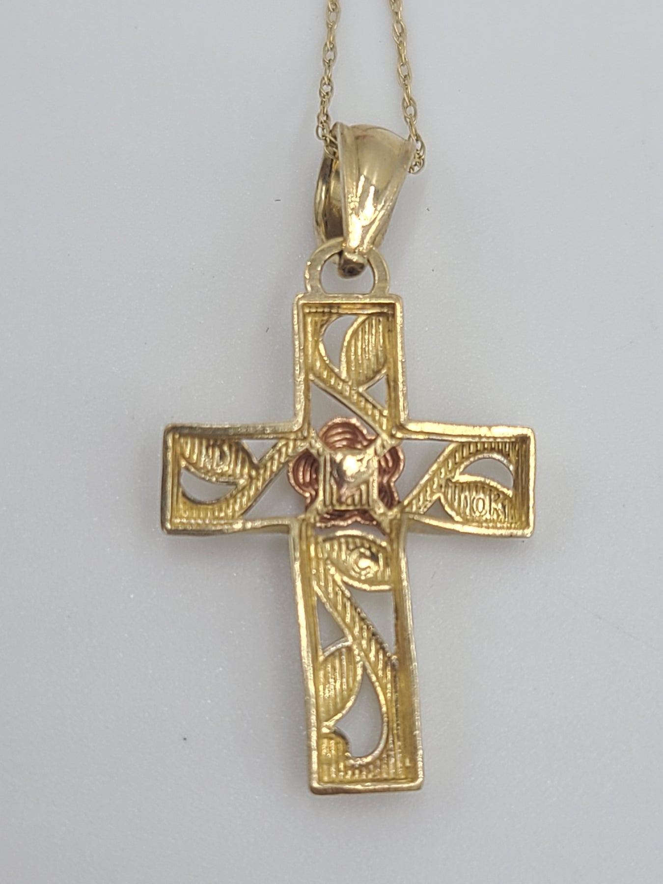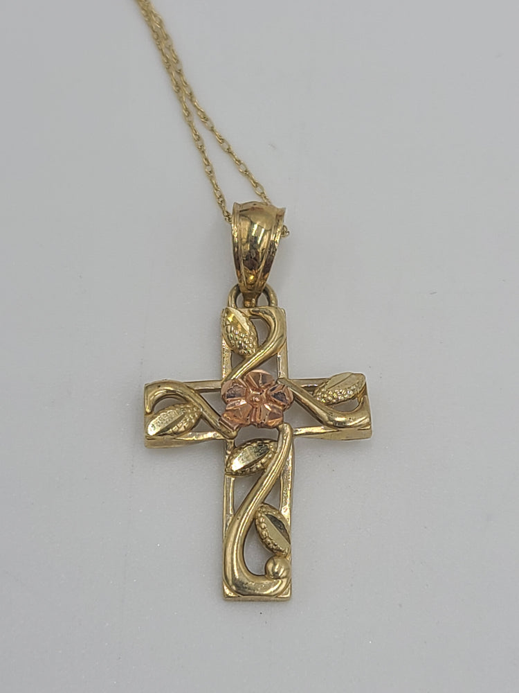 This isa pretty little cross set in 10kt yellow gold. It features a small rose gold flower in the center. Comes with 18" link chain. Both are stamped. Would be a nice anniversary, birthday, Christmas, Mother's Day or Valentine's Day gift for her.