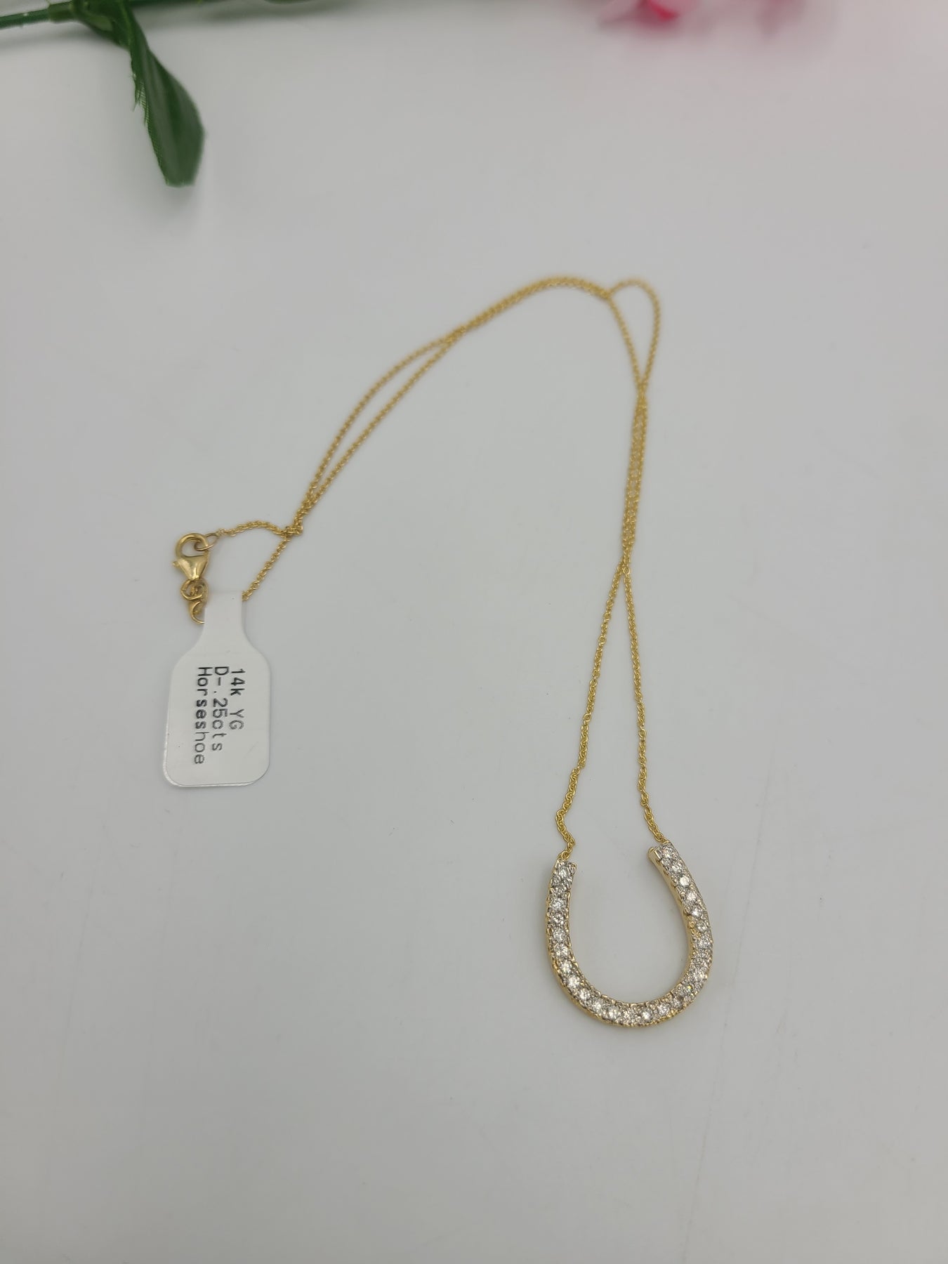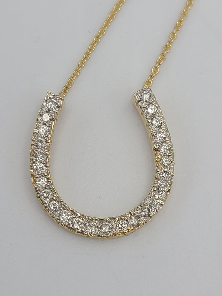 Add a touch of good luck to your jewelry collection with this stunning 14kt yellow gold horseshoe pendant necklace. This gorgeous diamond horseshoe pendant features 25 round cut diamonds on a 16" link chain. This piece of fine jewelry is perfect for those who love luck-themed pieces and want to add a touch of sparkle to their outfit. Perfect for any occasion. Stamped 14k on clasp.