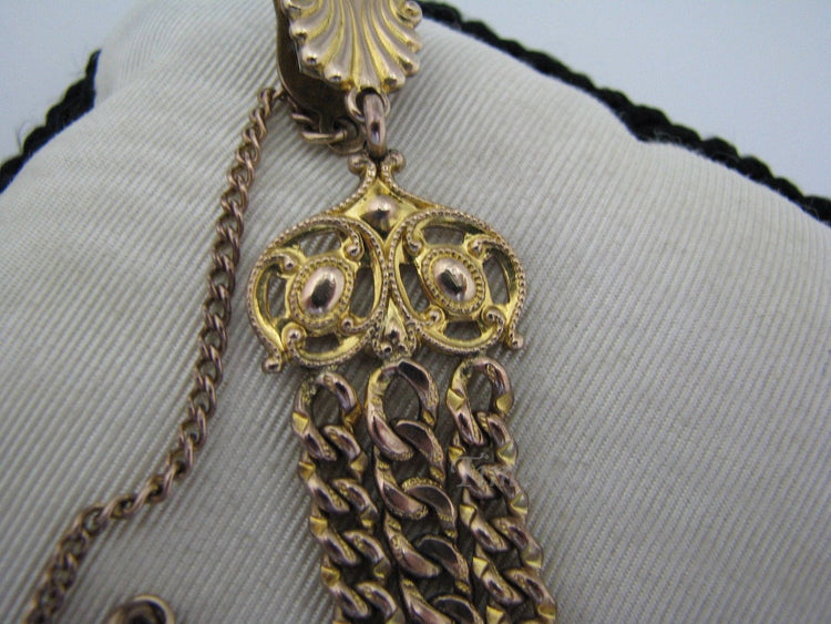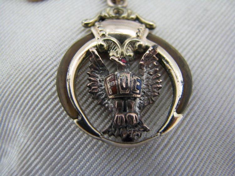 No major flaws or imperfections!This fob features three chains with filigree links at either end and is 3" long and 7/8" wide on a waist clip. The watch chain is 5" long. Hanging from the bottom of the fob is a FOE Medallion. The fob and chain are in good cosmetic condition for their age. They have light wear, and light discoloration from being lightly used and aging. The waist clip is stamped PAT'D. The watch spring clasp is stamped JAG.