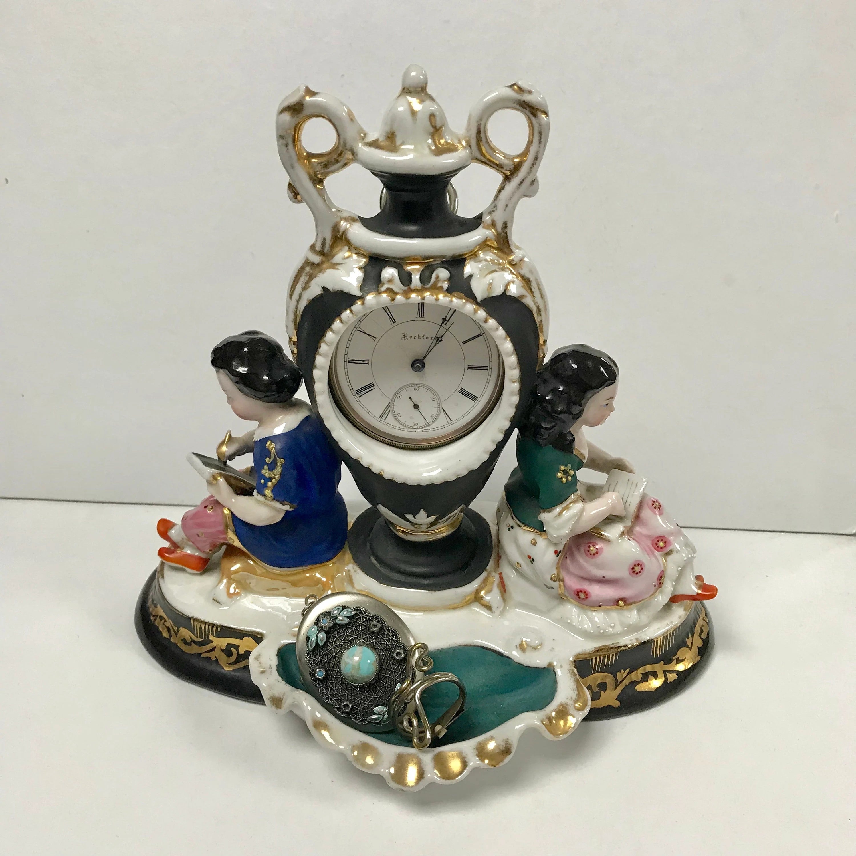 f284 Vintage Ceramic Pocket Watch & Jewelry Holder Stand Case Collectible