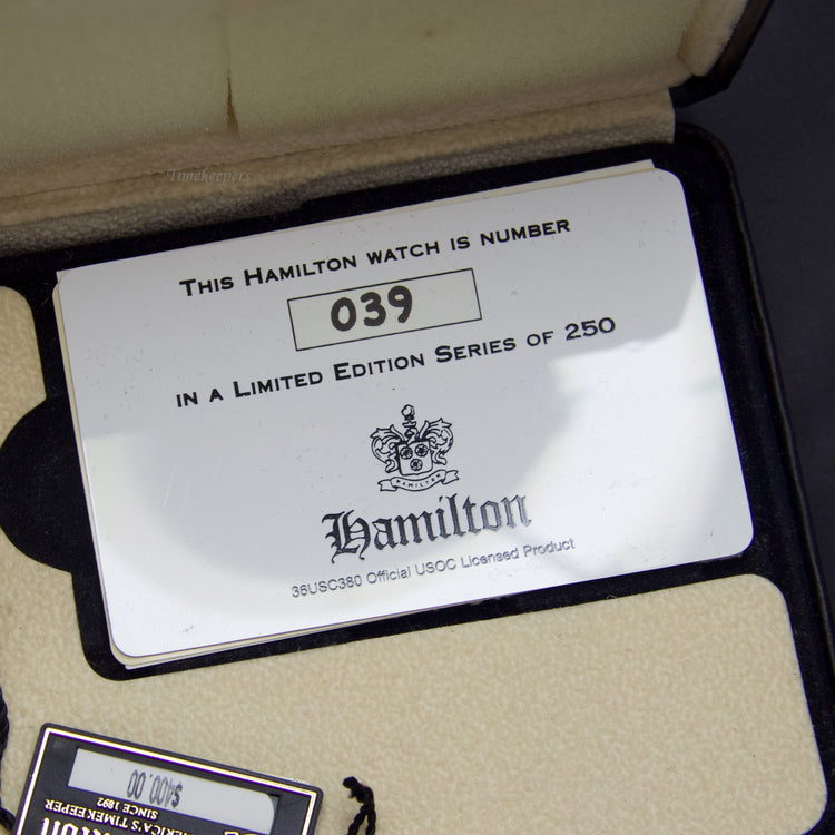 For the Centennial 1996 Atlanta Olympic Games, Hamilton Watch Co. introduced a special edition collection of USA Olympics watches. There were five (5) watches in the collection and one pocket watch. Only 250 pieces were produced of each.