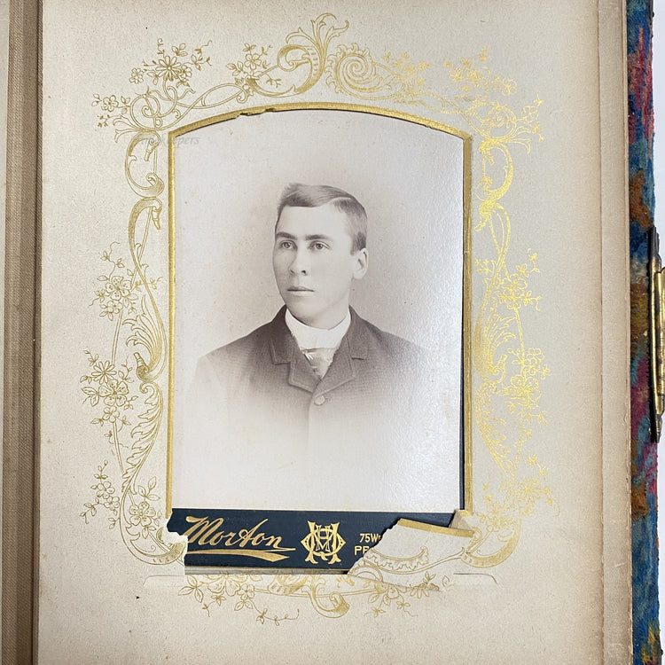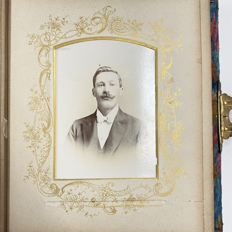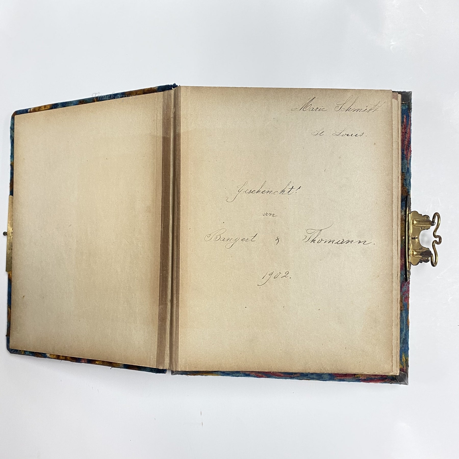 Dated 1902, this album is in pretty worn condition. Pages are very fragile, yellowish and many of them torn. Several antique pictures included, they are not permanently glued and can be removed from the bottom slits.