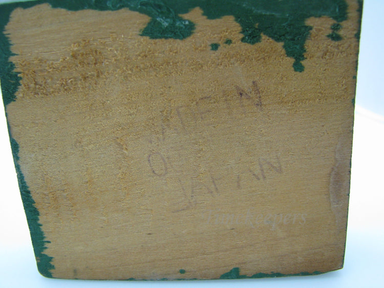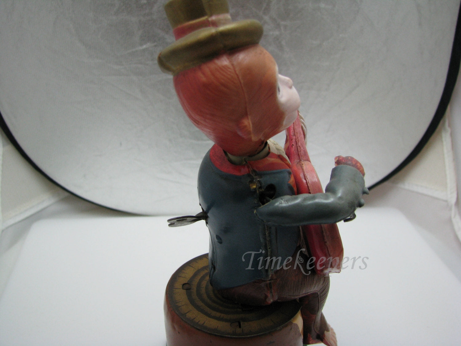 This fun little guy is a tin wind up toy from the 1930's and sits on a wood base. When you wind him up his arm goes up and down to play the banjo with his head moving from side to side. Not sure of the song he is playing but he does still work. This guy does show some wear and tear due to his age. His colors are still vibrant. The bottom of the wood base is stamped made in Japan.