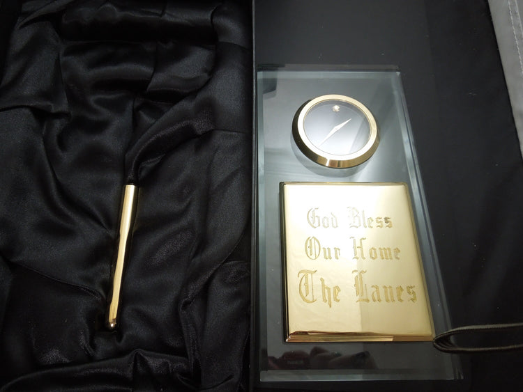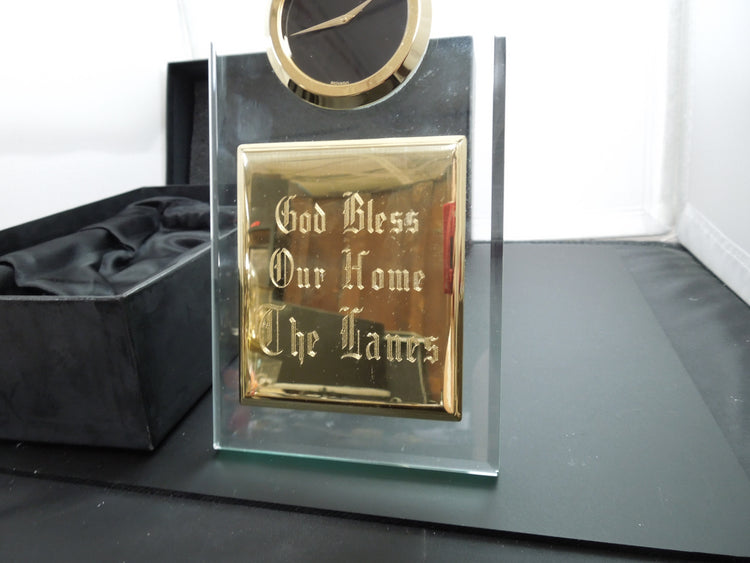 Beautiful Plaque stand featuring an automatic Movado clock face in black & gold and a gold plaque that says "God Bless Our Home The Lanes" . This classy plaque has a gold stand and comes in a silk lined box.