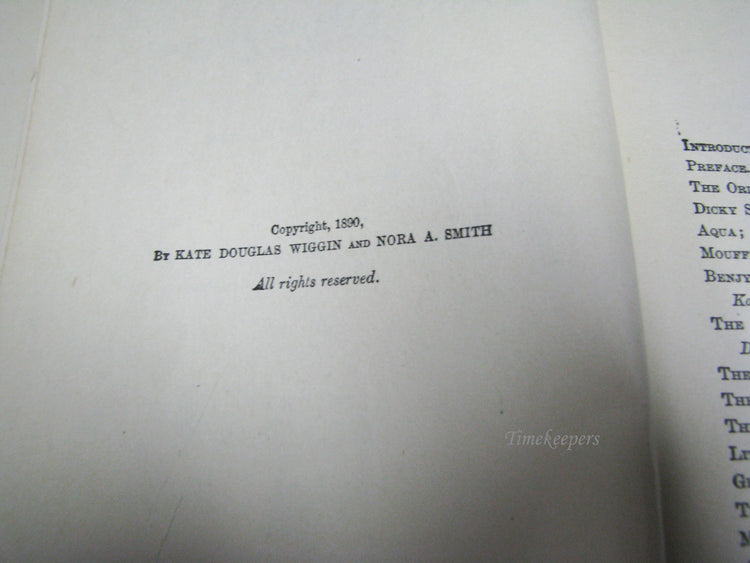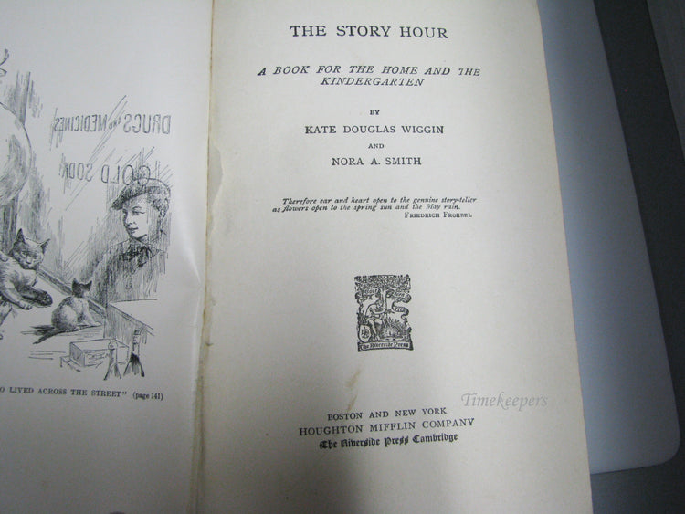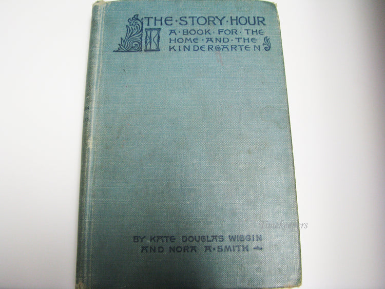 The Story Hour, A book for the home and the kindergarten by Kate Douglas Wiggin and Nora A. Smith. Boston and New York, Houghton Mifflin company, The Riverside Press Cambridge. Copyright 1890. Cloth binding. Bind torn from spine. The corners are frayed. The inside pages are yellowed. 185 pages.