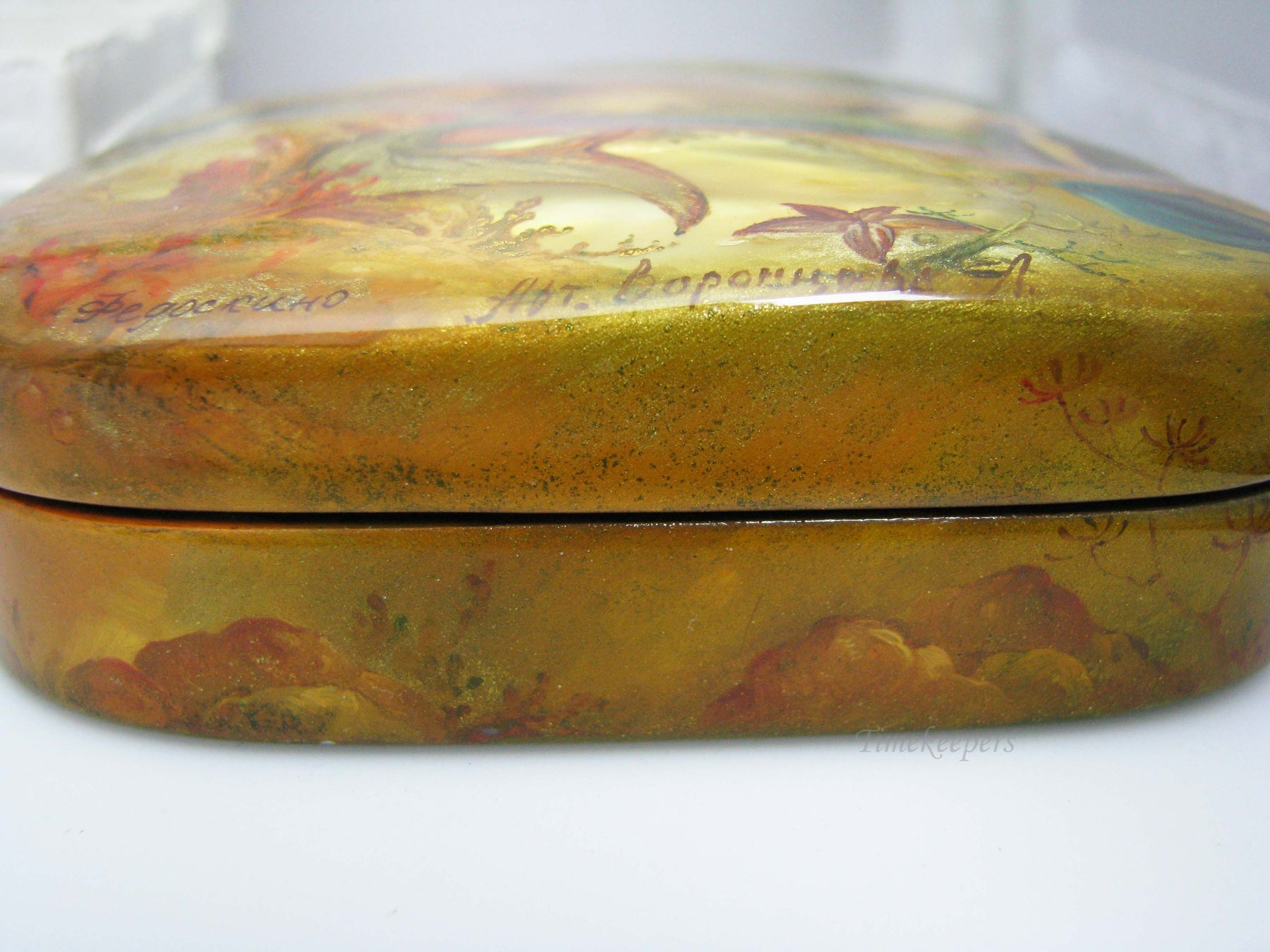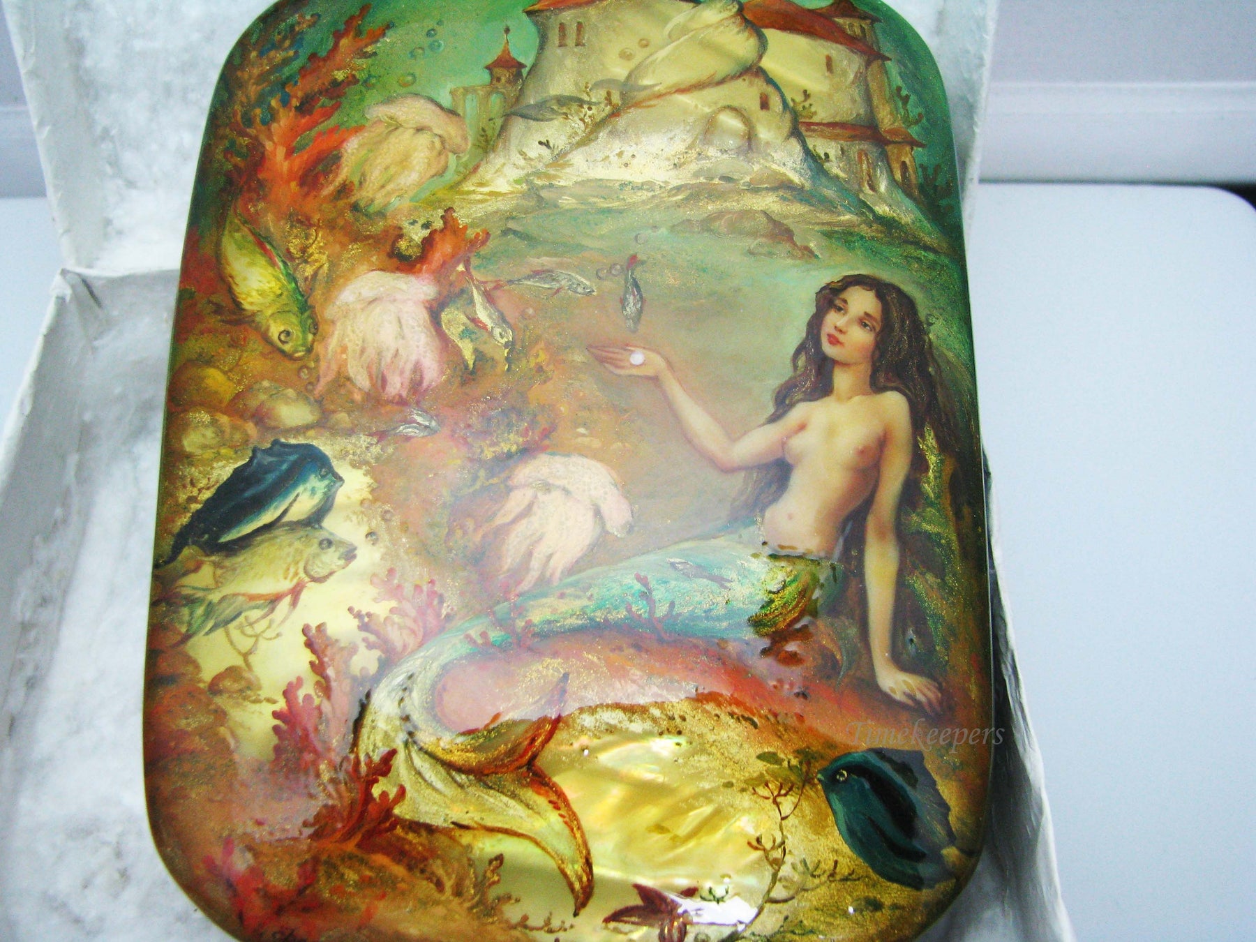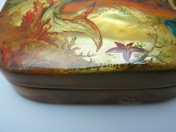 PLEASE READ ENTIRE DESCRIPTION BEFORE PURCHASING Nice Fedoskino Russian Lacquer Box Rusalochka or "The Little Mermaid" by Vorontsova Please see pictures for more details! Features: This is a Gorgeous box with a hinged lid. This box is called Rusalochka or "The Little Mermaid" by Vorontsova. The top is contoured with shell. Typical red lacquer paint inside. In good condition. Small surface scratches from use. (AS SEEN IN PICTURES)