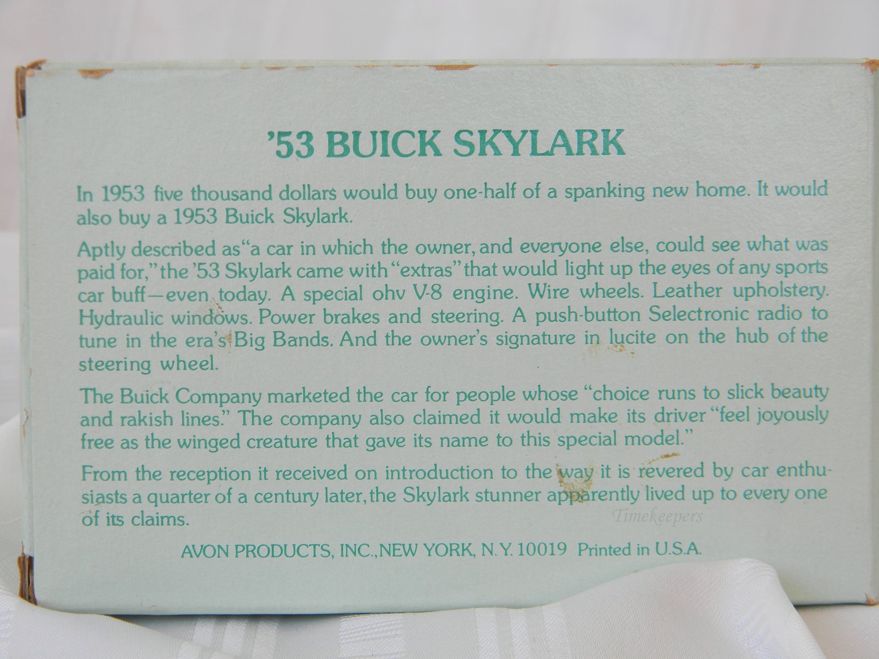 For Sale: Avon 1953 Buick Skylark After Shave Bottle in Original Box PLEASE READ ENTIRE DESCRIPTION BEFORE PURCHASING Please see pictures for more details! Pre-owned: Box is original. Box does show some age. Collectors will like this car. Avon after shave bottle 1953 Buick Skylark in original box with all stickers and parts unused. All weights, measurements and colors are approximate and may vary slightly from the listed dimensions or as seen in the image. All pictures are magnified to show the smallest of details. Please, refer to the item description for actual weight and size evaluation.