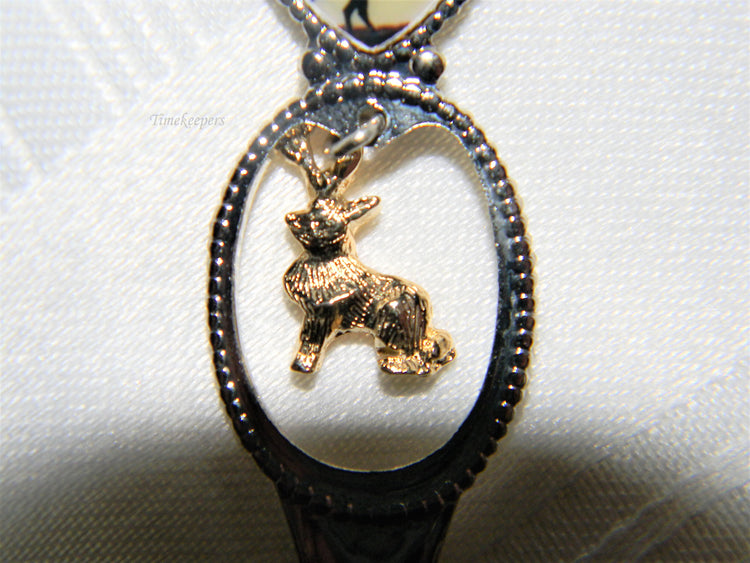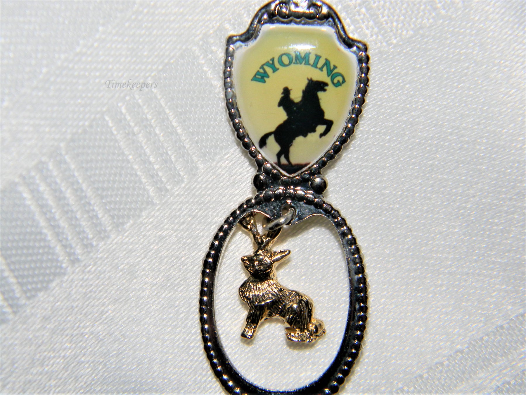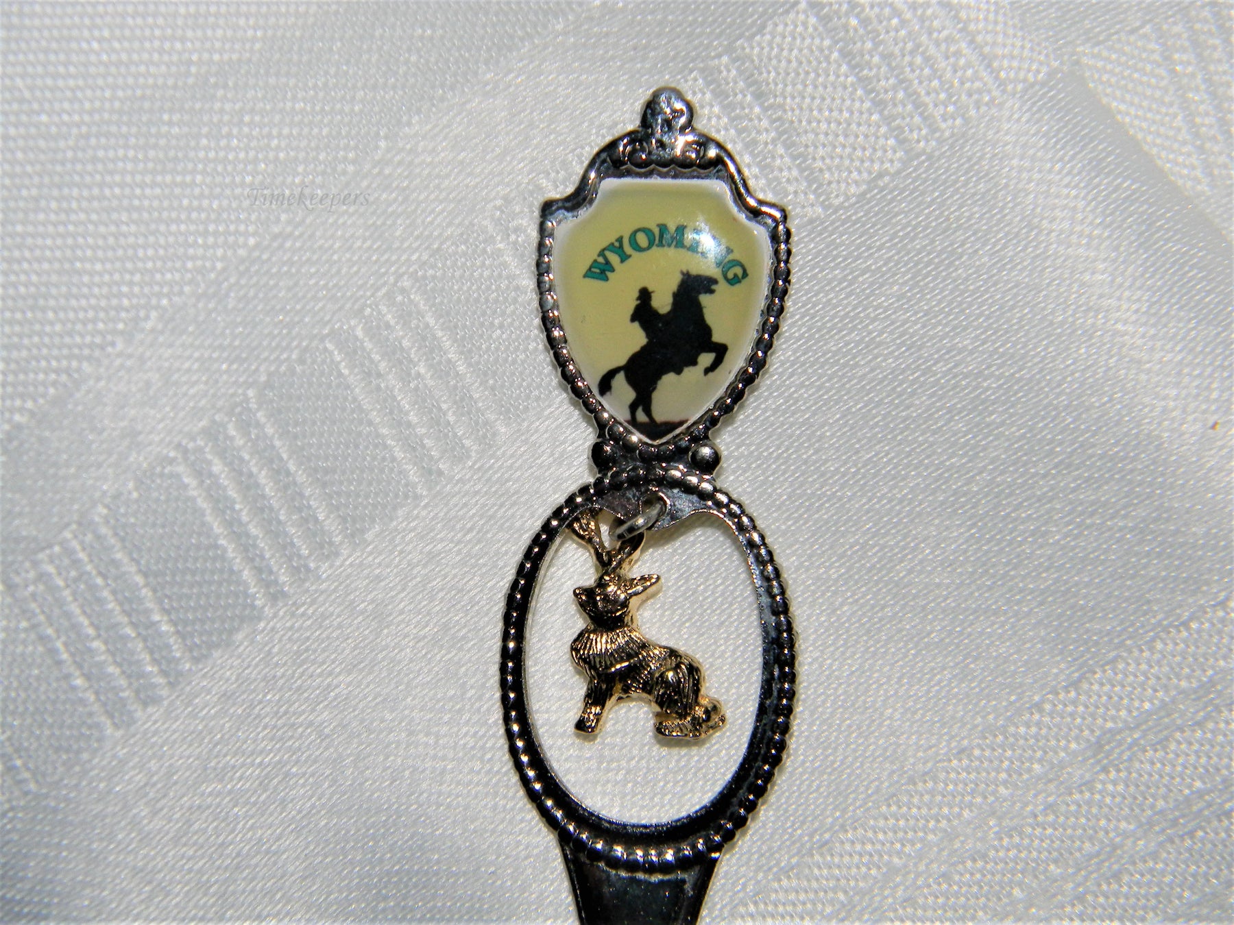 This spoon features a cowboy on a horse with a dangling gold tone jackalope charm. The bowl of the spoon highlights Wyoming, The Equality State.