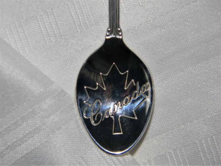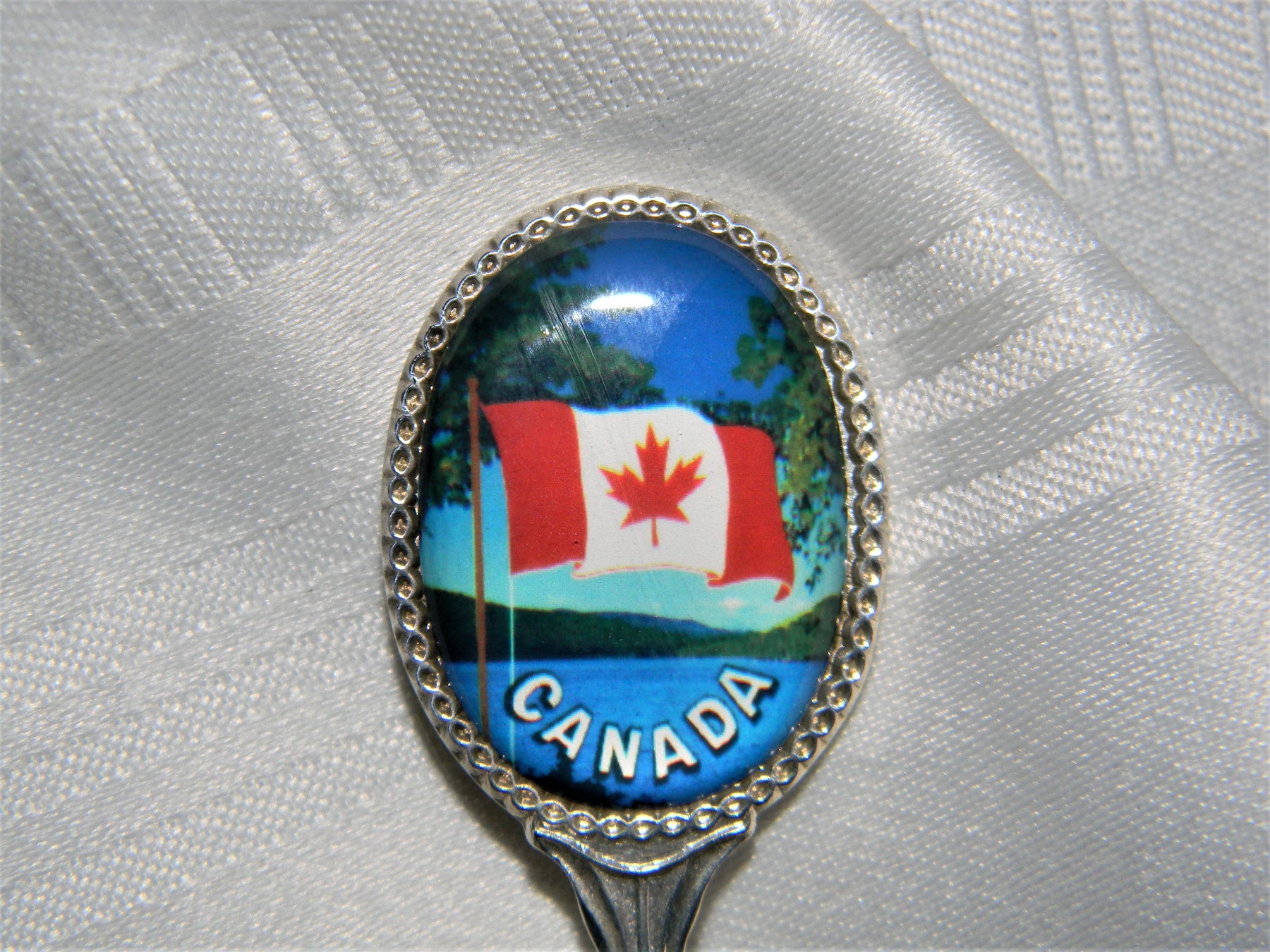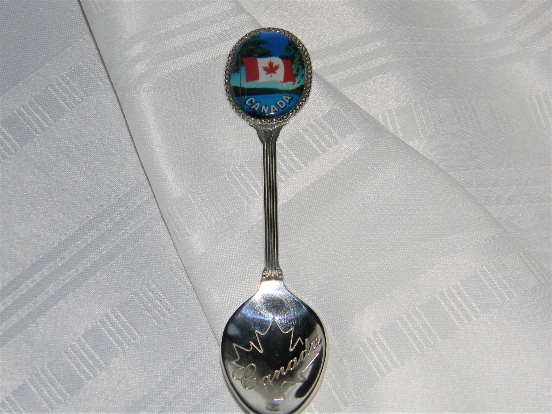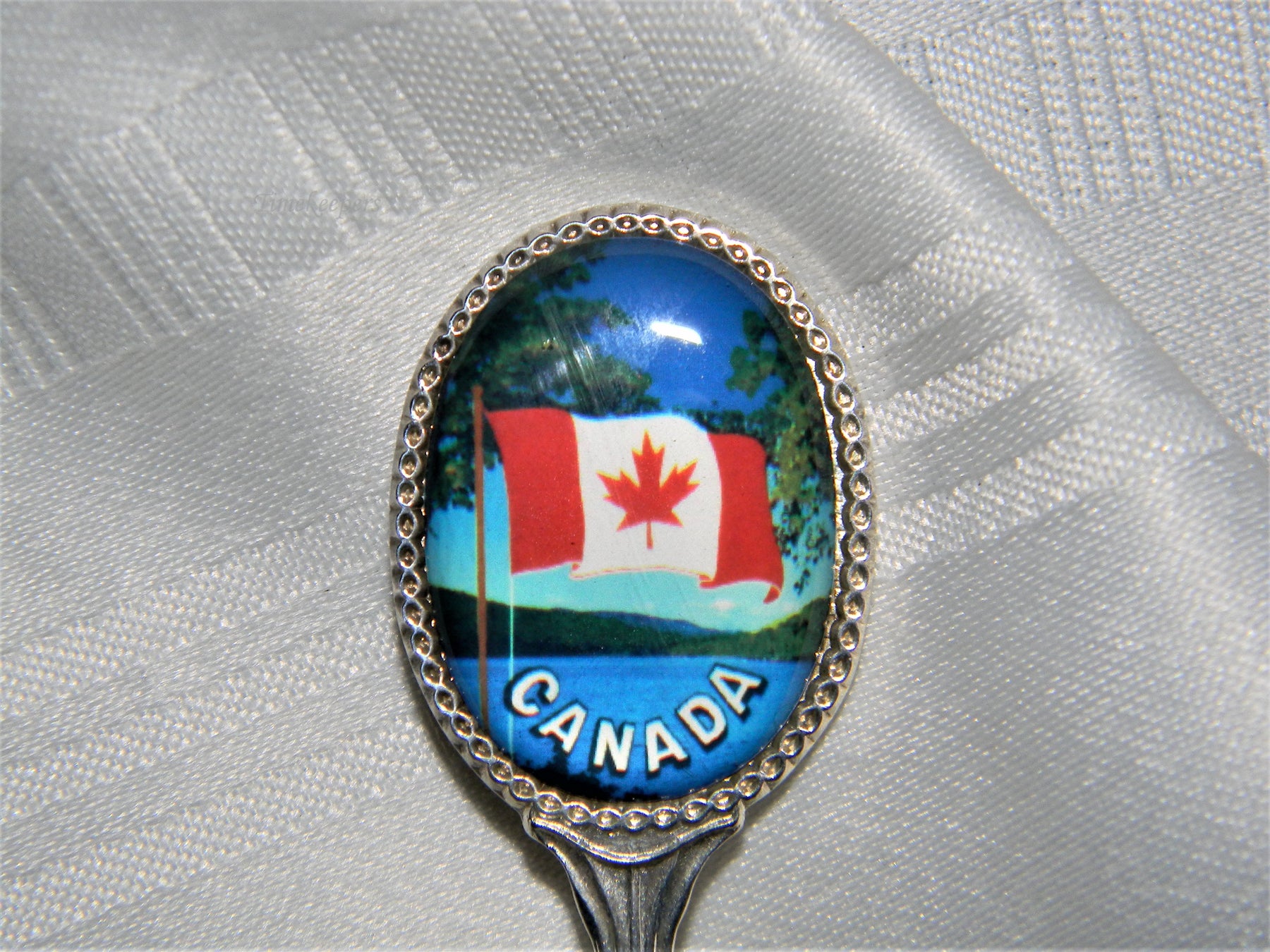 This spoon features a picture of the Canada Flag at the top. The bowl of the spoon features a maple leaf with Canada across the bowl.