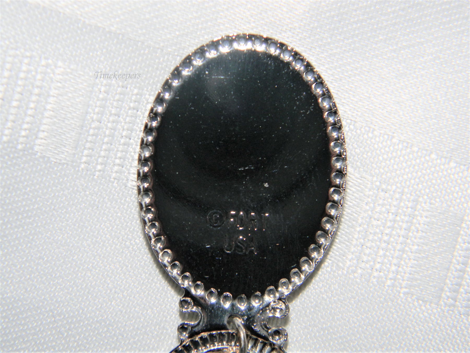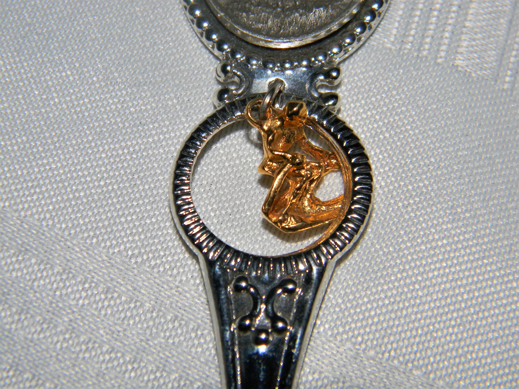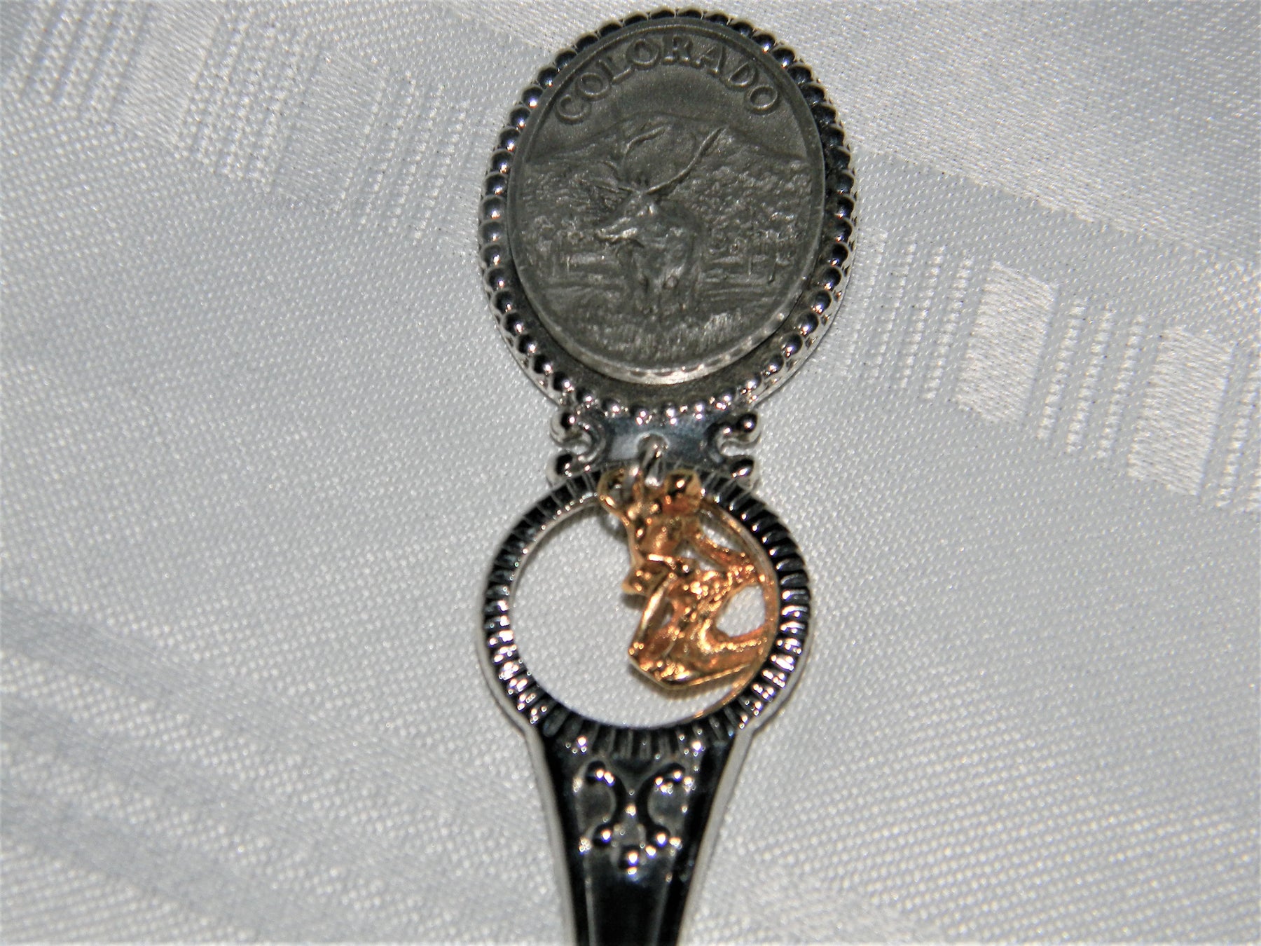 This spoon features a pewter medallion at the top with a picture of a moose with the mountains in the background. The charm is a gold tone skier. The back of the spoon is marked Fort USA.