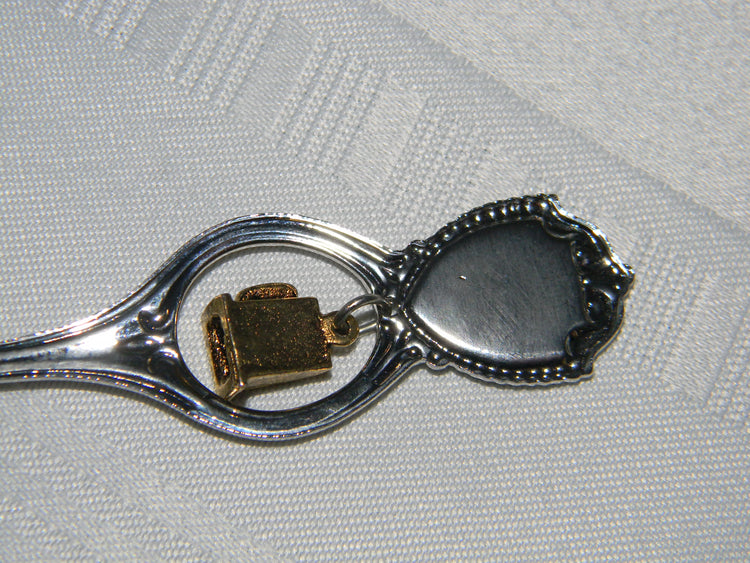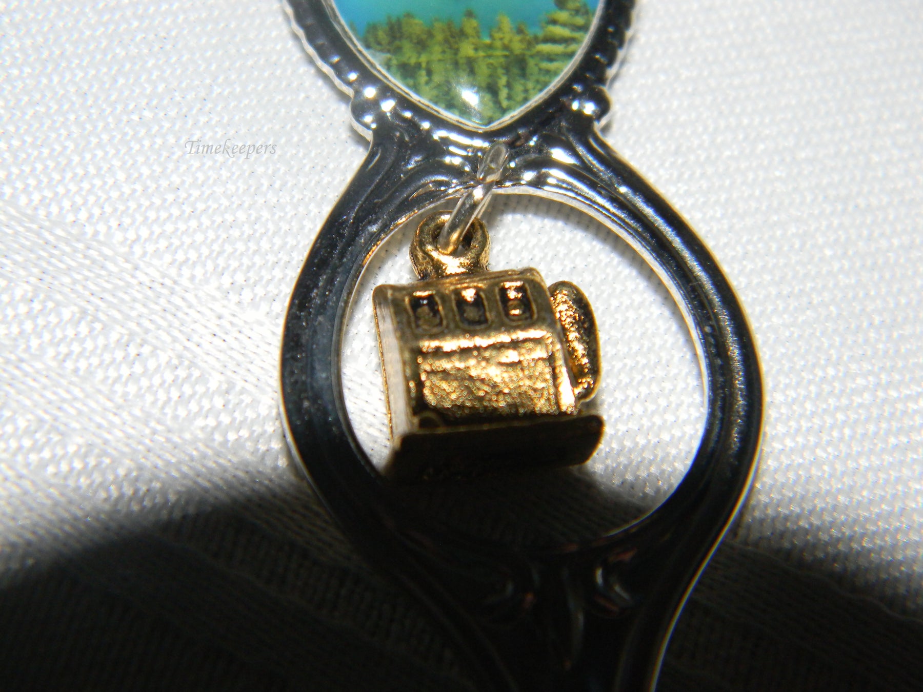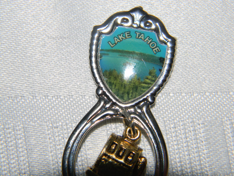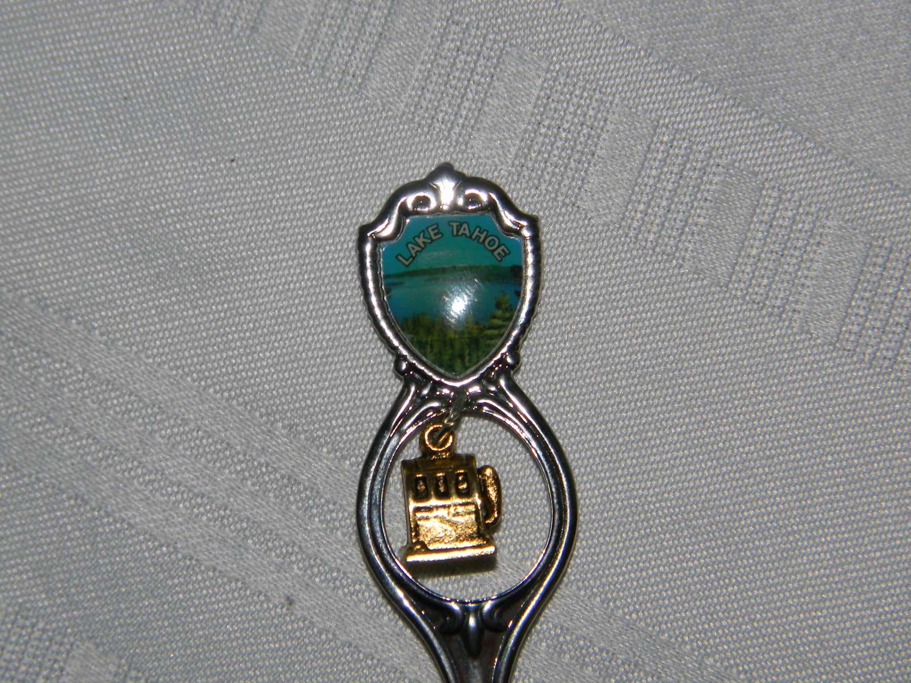 This spoon features a picture of Lake Tahoe in acrylic at the top of the spoon with a gold tone slot machine charm.