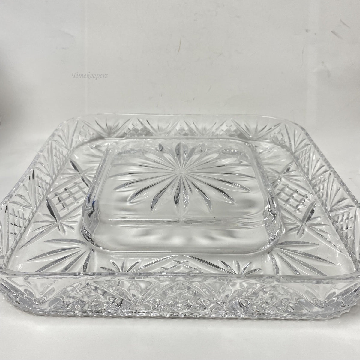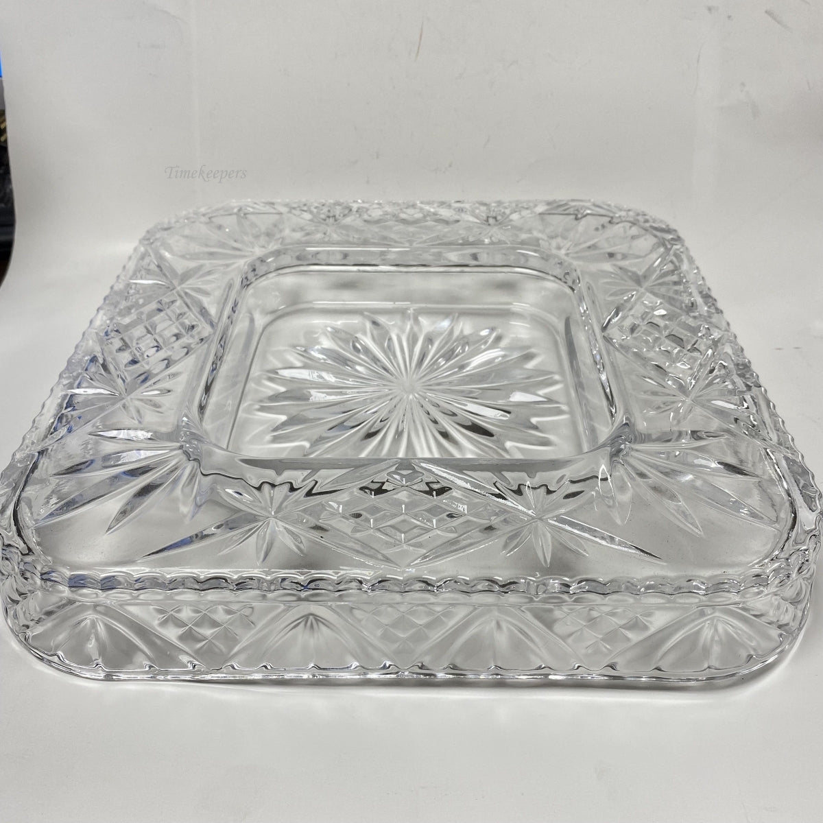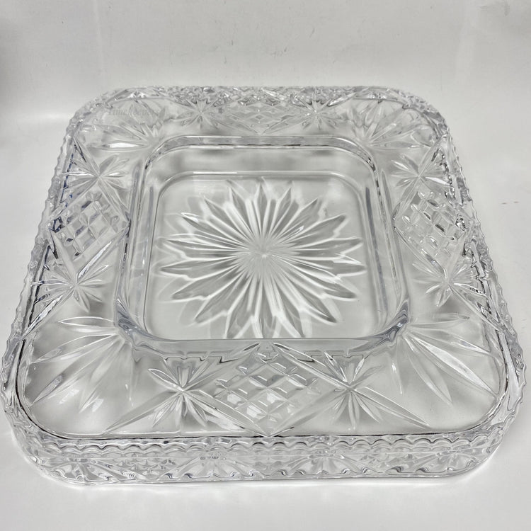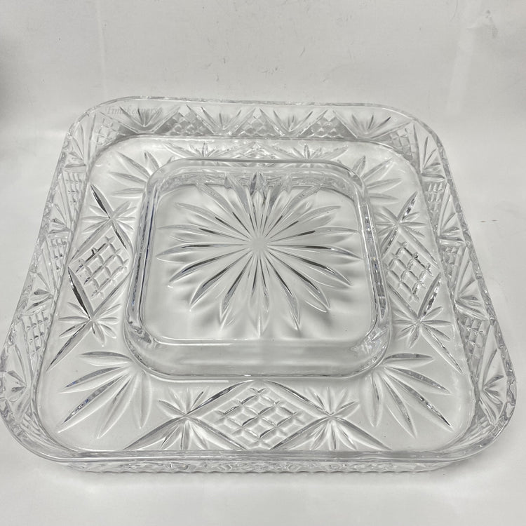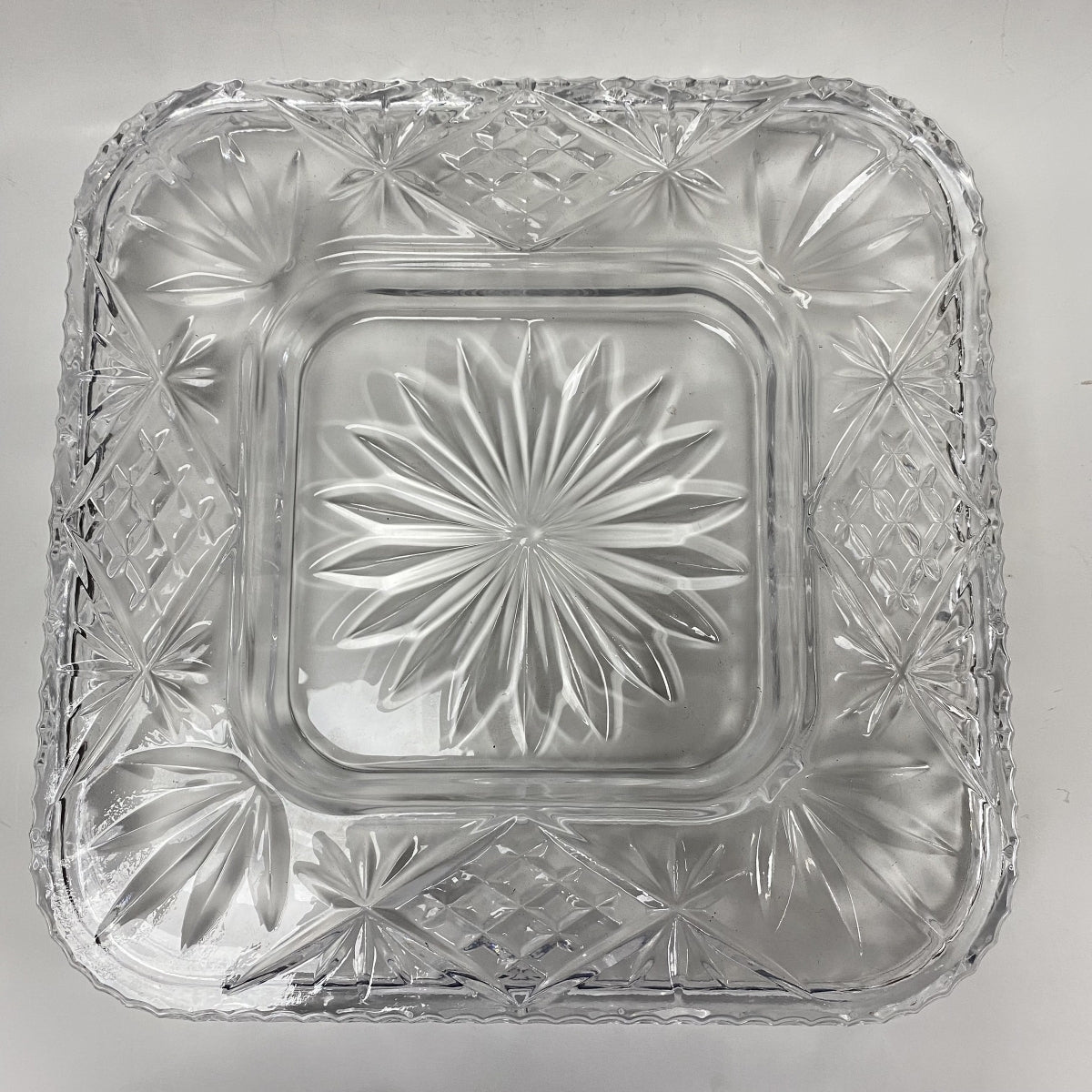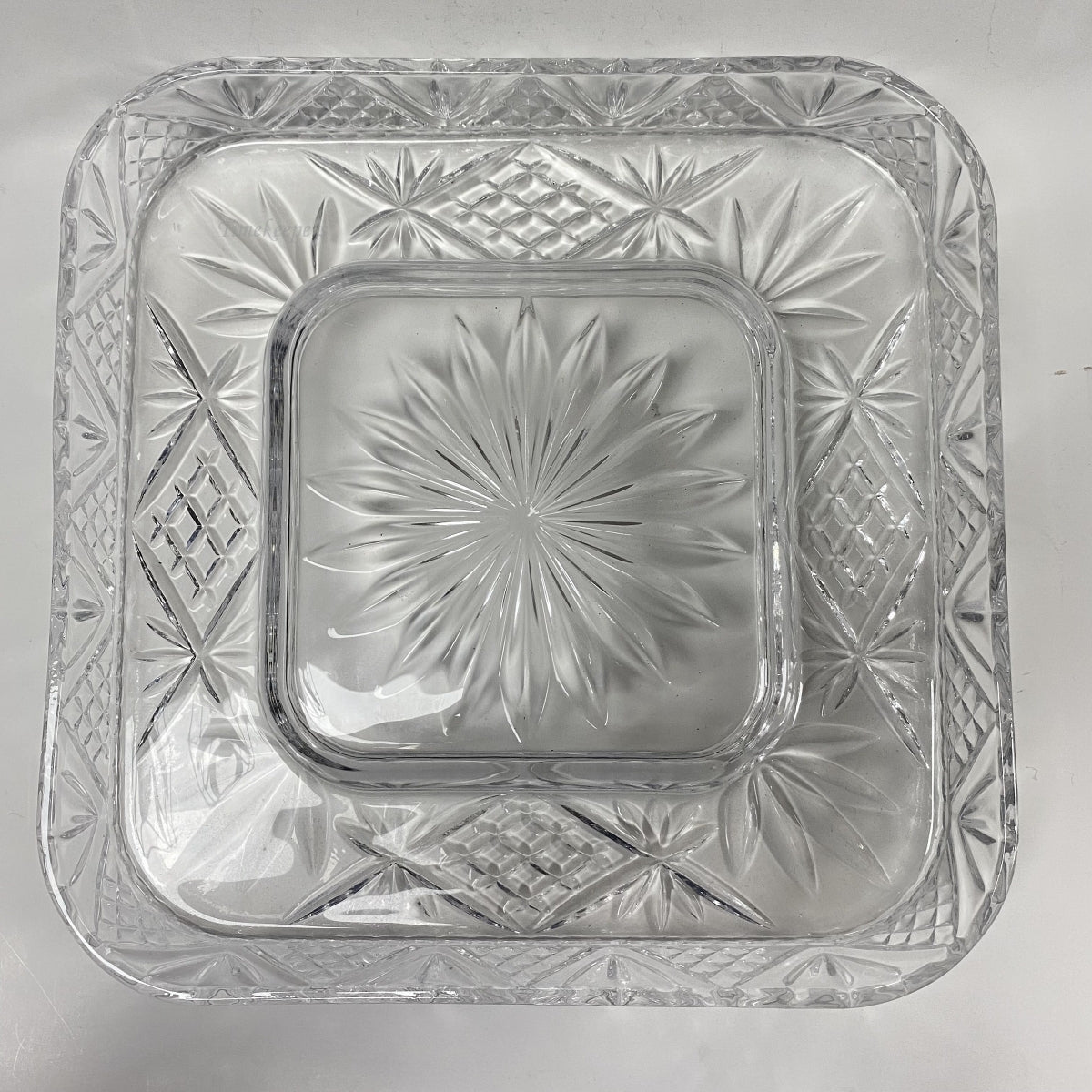 - Clear Crystal Square Shaped Serving dish/bowl. Can serve saldss or candy on one side and cookies and chips if turned upside down.