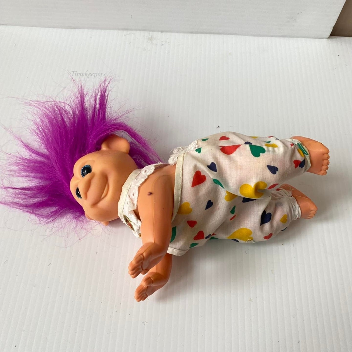 Vintage Baby Doll Troll. Fabric Overalls, hard plastic body with limited motion, plastic/rubber face, turns side to side. Purple Hair.