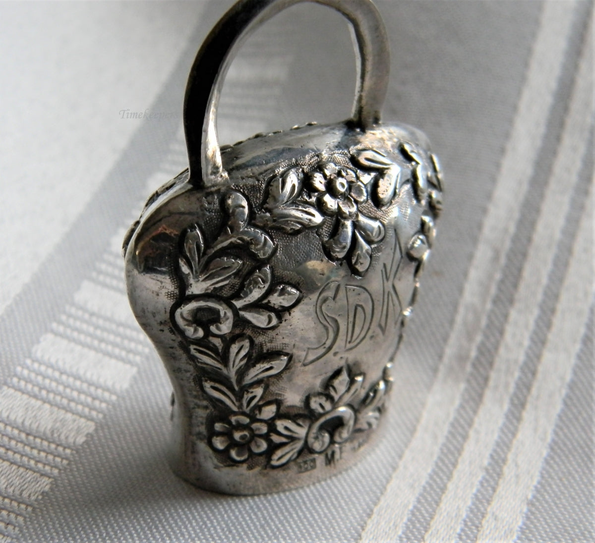 This is a nice vintage 800 silver embossed bell. The front is engraved SDK. The markings on this bell are 800 M.P 0.800. There is some tarnish and some tarnish on this bell.