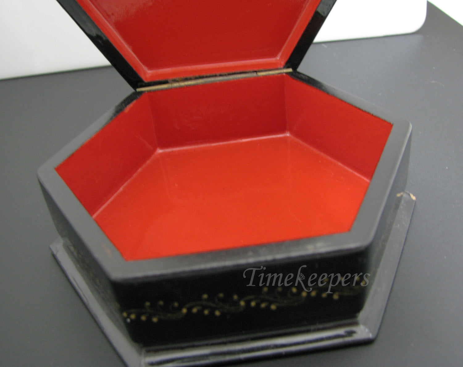 This is a gorgeous octagon shaped box has a hinged lid. The hand painting shows a Troikia scene of (3) horses in red with gold painted trim work. Typical red lacquer paint inside. This piece does show the Palekh, Troikia, and artists name. This piece is not dated.