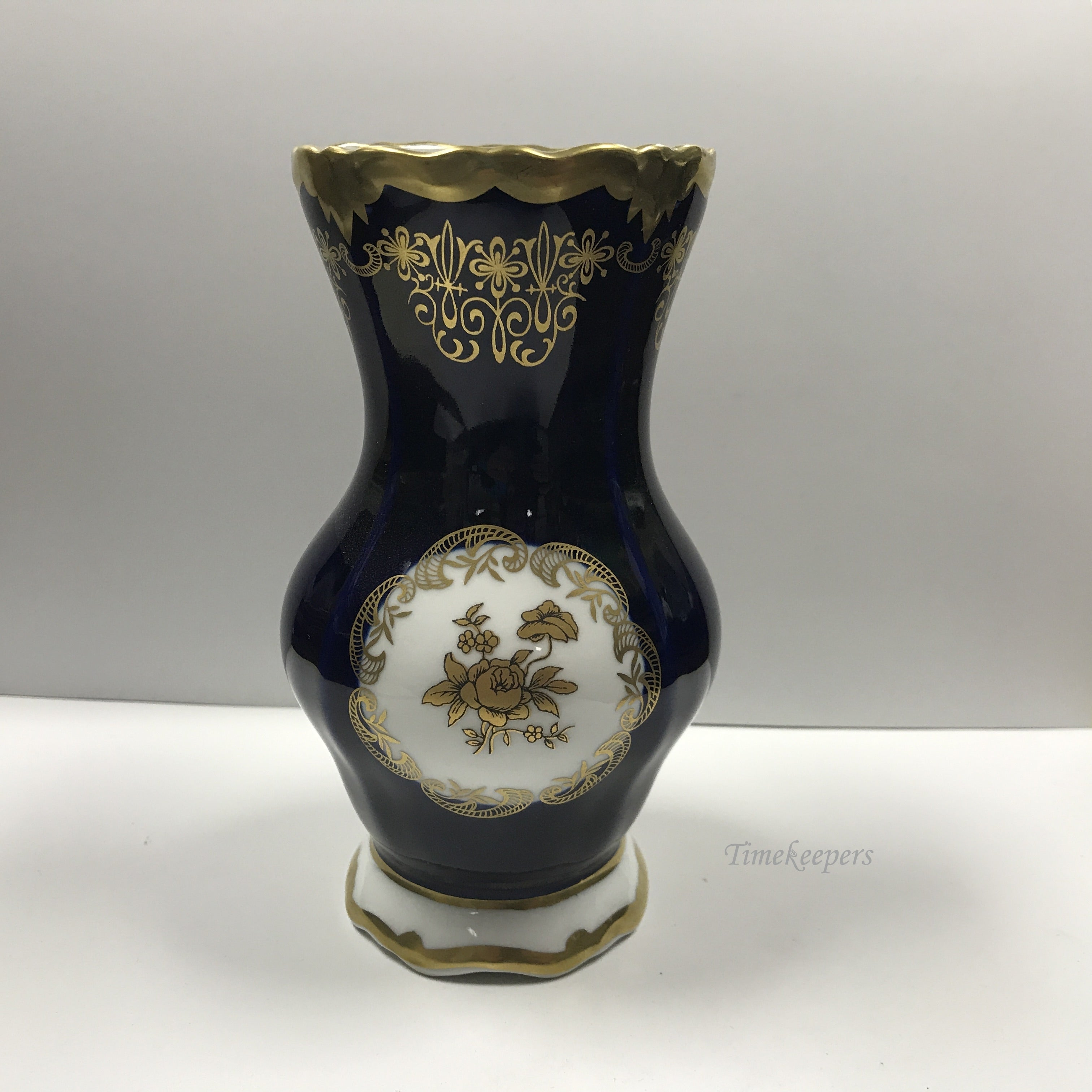 d202 Vintage Original Porcelain Cobalt Blue Gold Enamel Ruffle Top Vase Made GDR