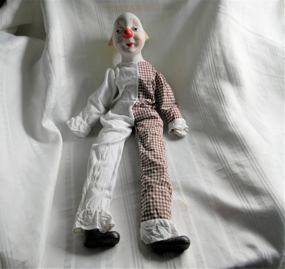 p120 Wonderful Vintage Clown Doll with cloth Body Porcelain Head, Hands, Feet