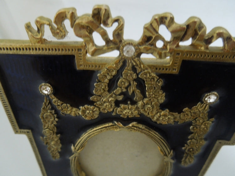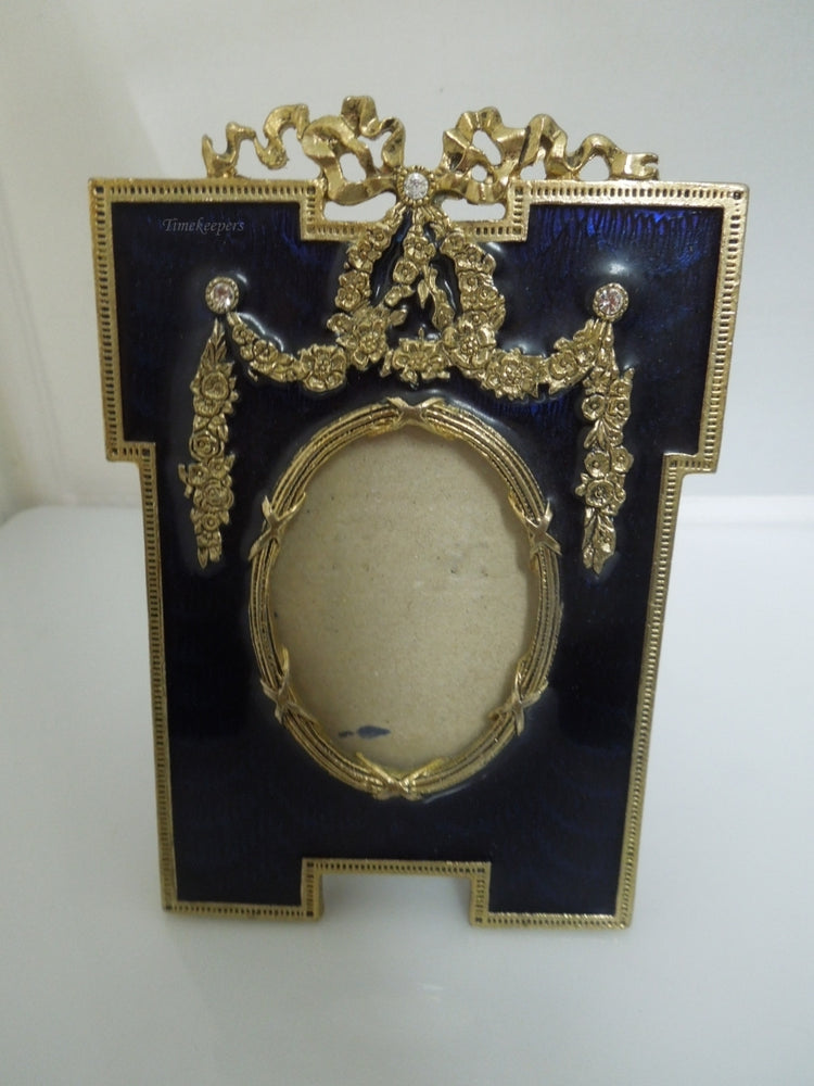 Blue Enamel and Brass picture frame, by Terragrafics Up for Sale is a Faberge-inspired Art Deco blue enamel and brass picture frame, made by Terragrafics (Burin Collection), 1989.The frame is somewhat ornate with brass swags and crystal adornments.It features a Design of striped Enamel with Gold Tone Metal detailing. Very heavy, quality frame.It is small and well-suited for table top display, measuring:Rectangle exterior: 4.5" x 3".Oval photo diameter : 2".The reverse has a sticker - © 1989 Terragrafics, Inc. Made in Thailand. The metal Terragrafics logo is attached to the stand. The promotional photo is included.
