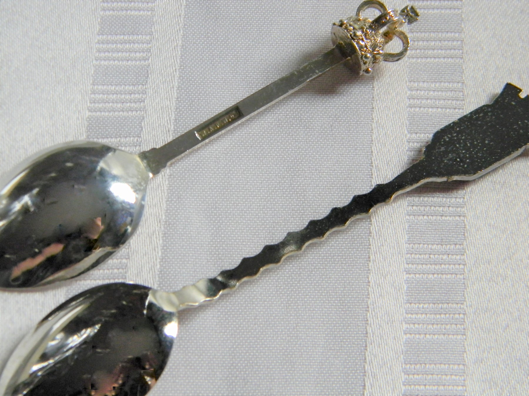 The spoon from London England is silver plated. Features a crown at the top and London engraved in the bowl of the s