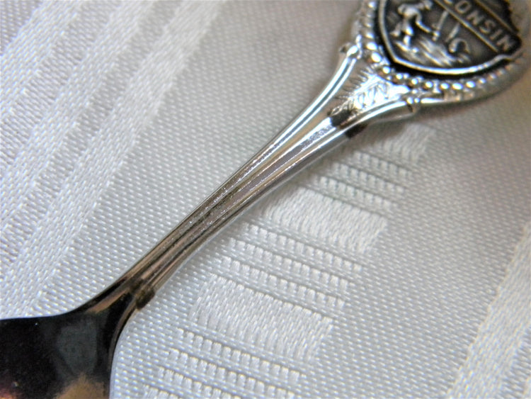 The Wisconsin spoon features a pewter shield with a fly fisherman. The back of the spoon is marked Japan.