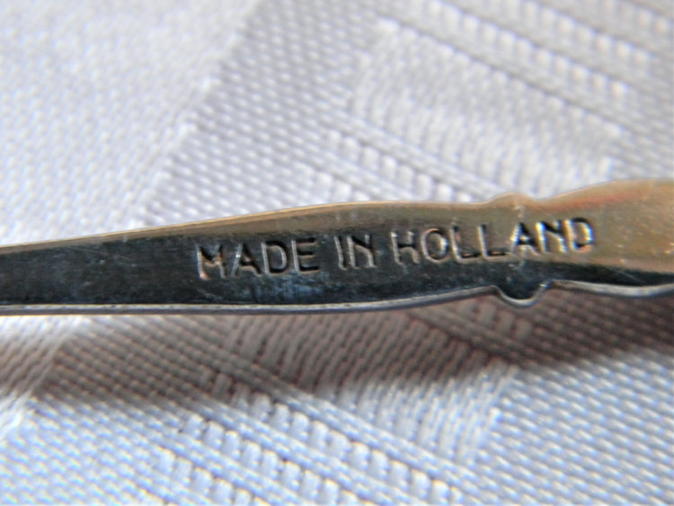 The St. Louis, Missouri spoon features a shaped top with the Arch, the old court house, the old Busch stadium and St. Louis on his horse. The back of the spoon is marked Made in Holland.