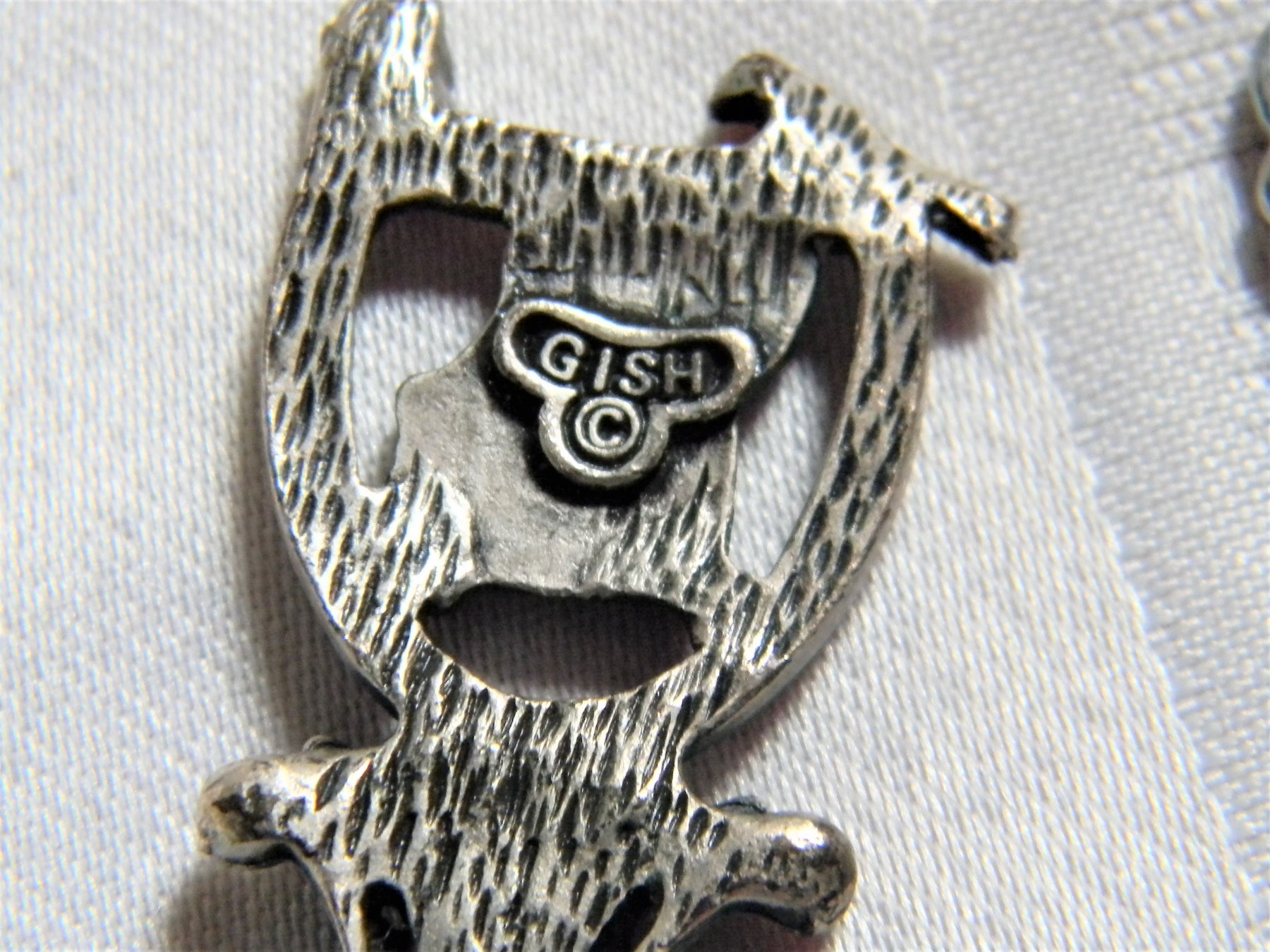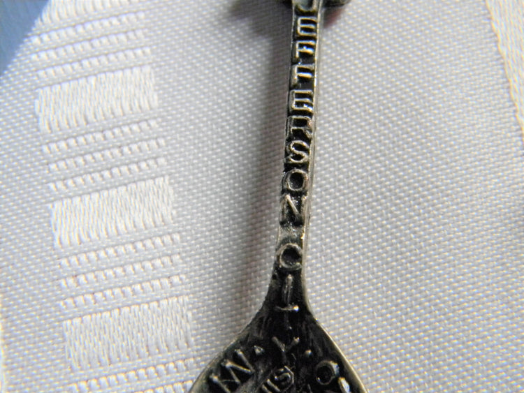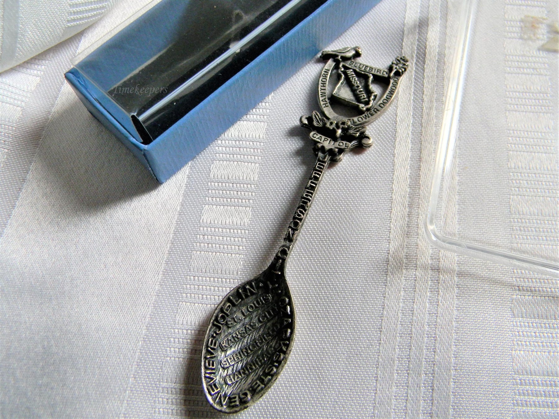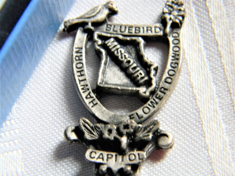 The Missouri State spoon features a blue bird the shape of the state, flowering dogwood and hawthorn at the top. Jefferson City is spelled out down the handle. The bowl of the spoon is marked St. Louis, Kansas city, Springfield, Hannibal, Ozarks, St. Genevieve and Joplin. The back is marked Gish.