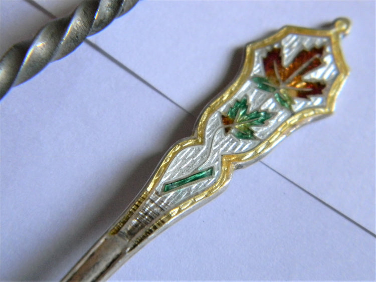 The Brooks Canada spoon features an enamel handle with Maple leaves. The bowl of the spoon is engraved Brooks. The back of the spoon is marked Sterling.
