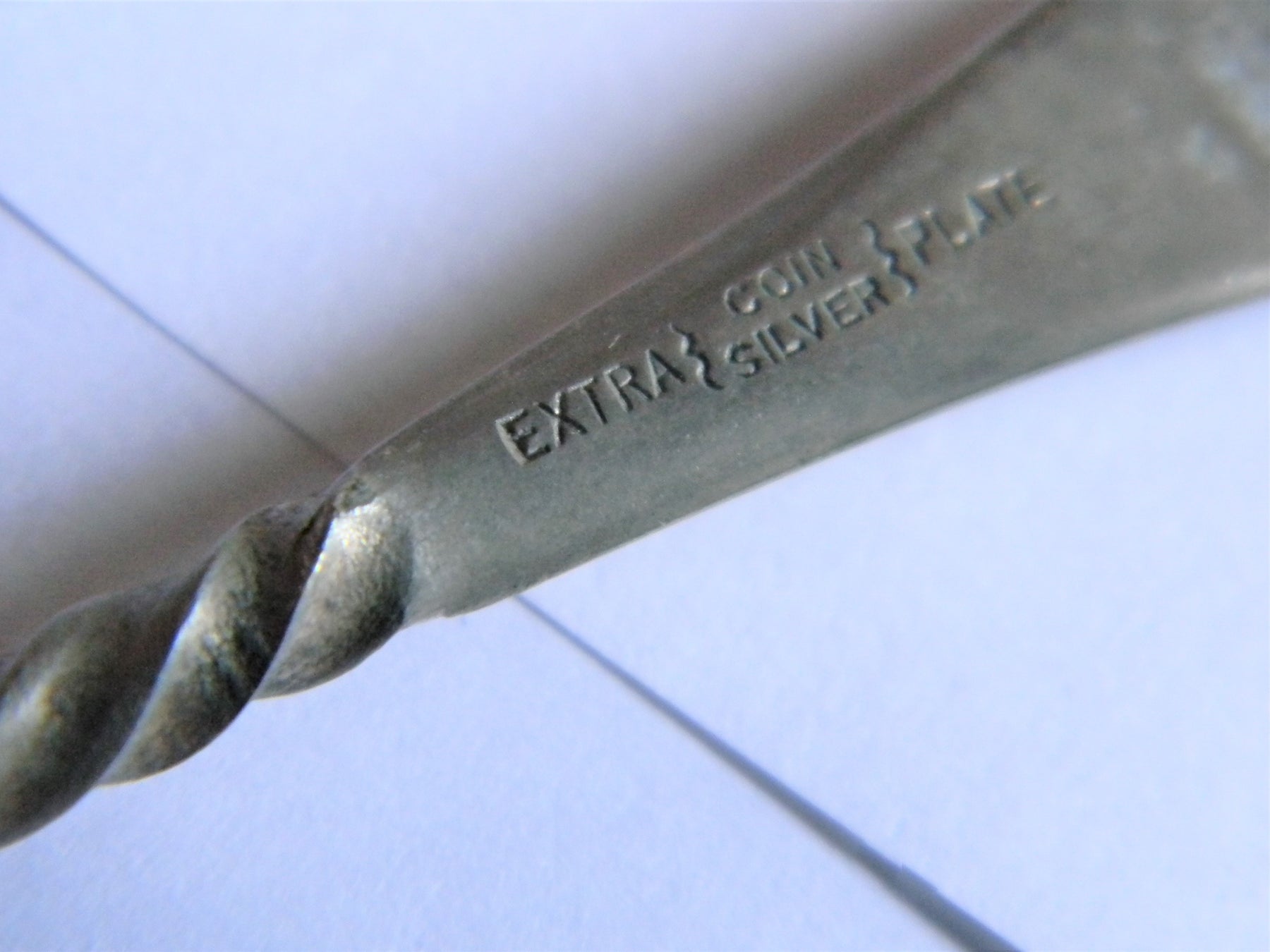 The demitasse coin silver spoon features a twisted handle. The back is marked Extra, coin silver, Plate.