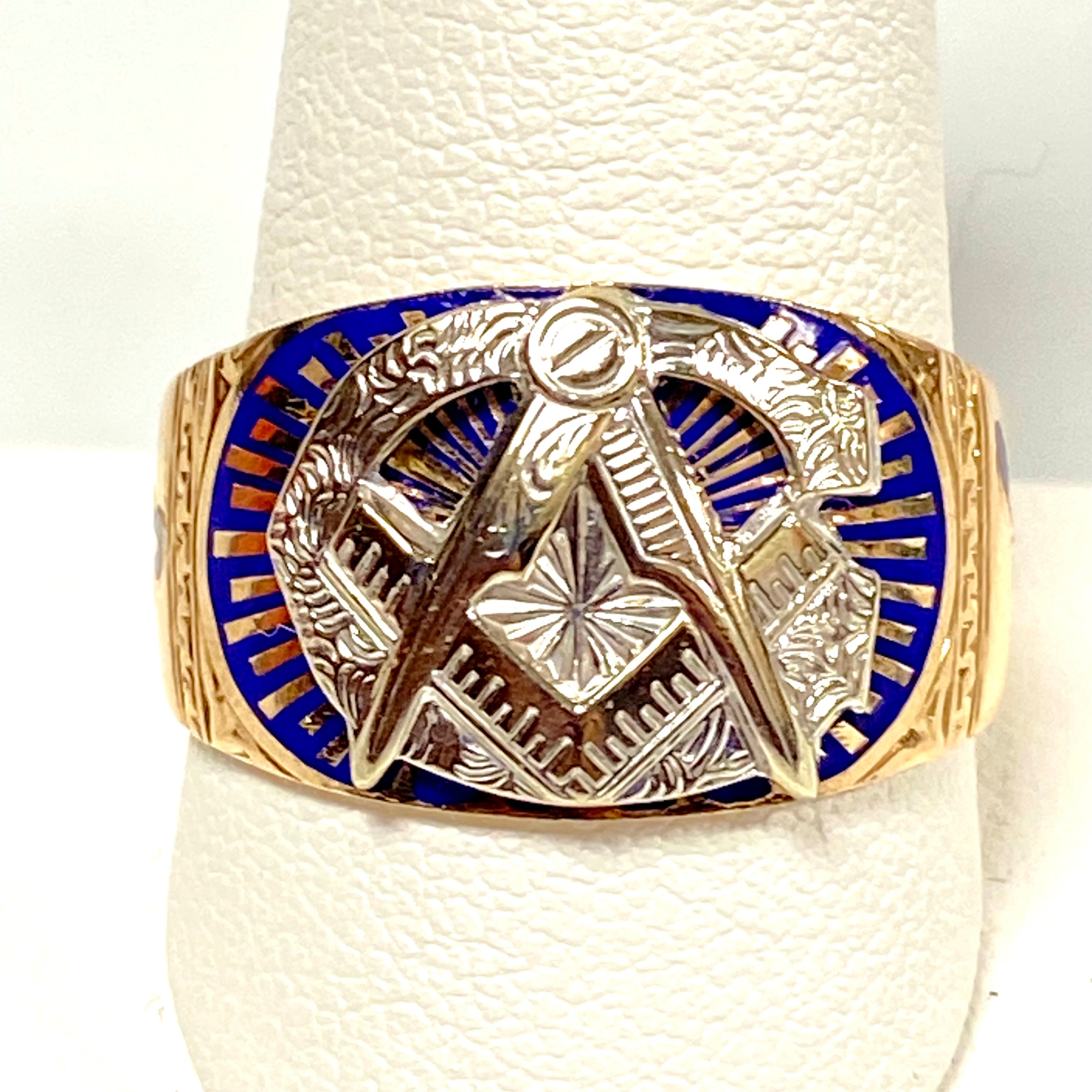u748 Vintage 10k Rose Gold Blue Enamel Masonic Wide Band Ring Ring Size 11