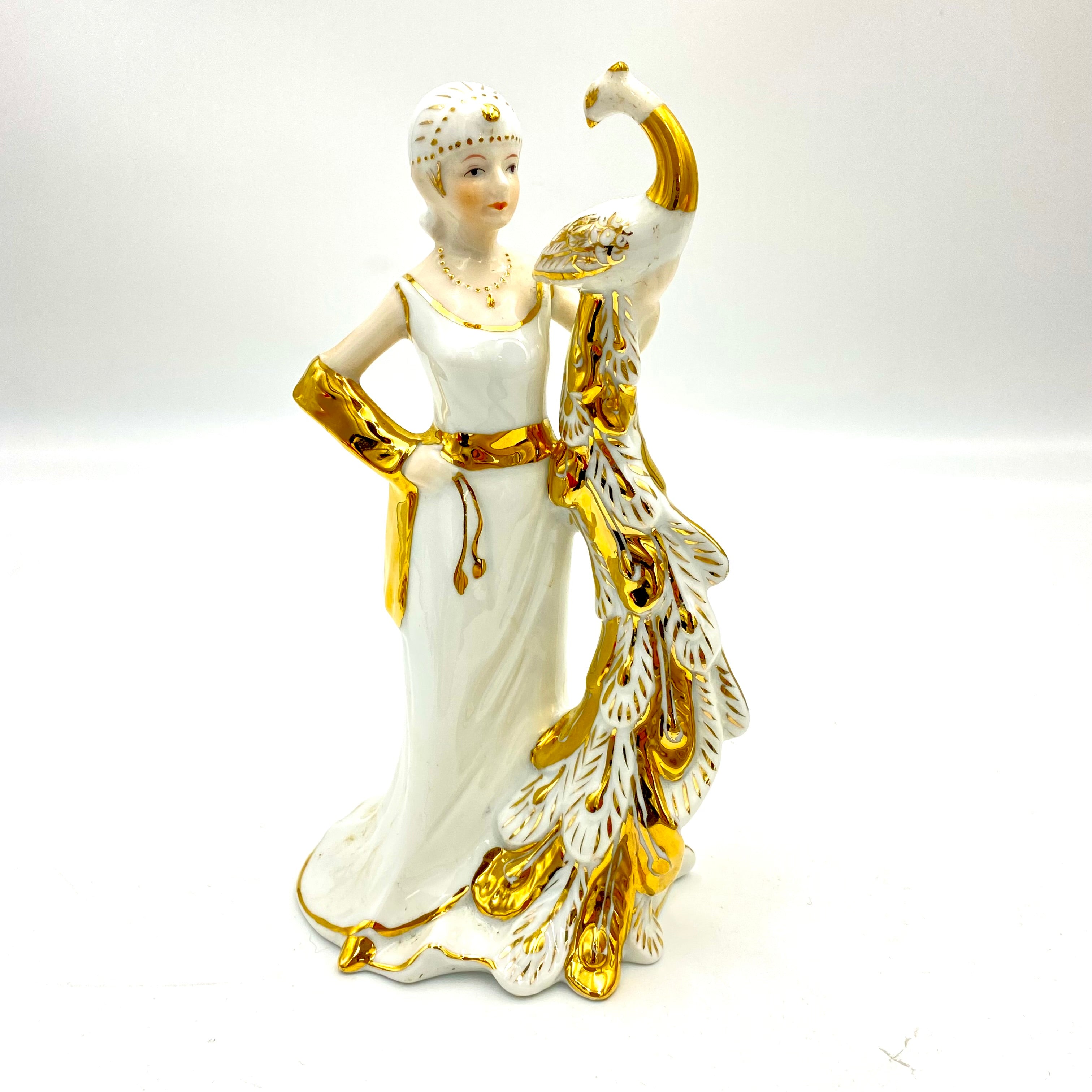 u798 Vintage Porcelain Peacock Princess Statue Stanning Gold Trim KPM 1950s
