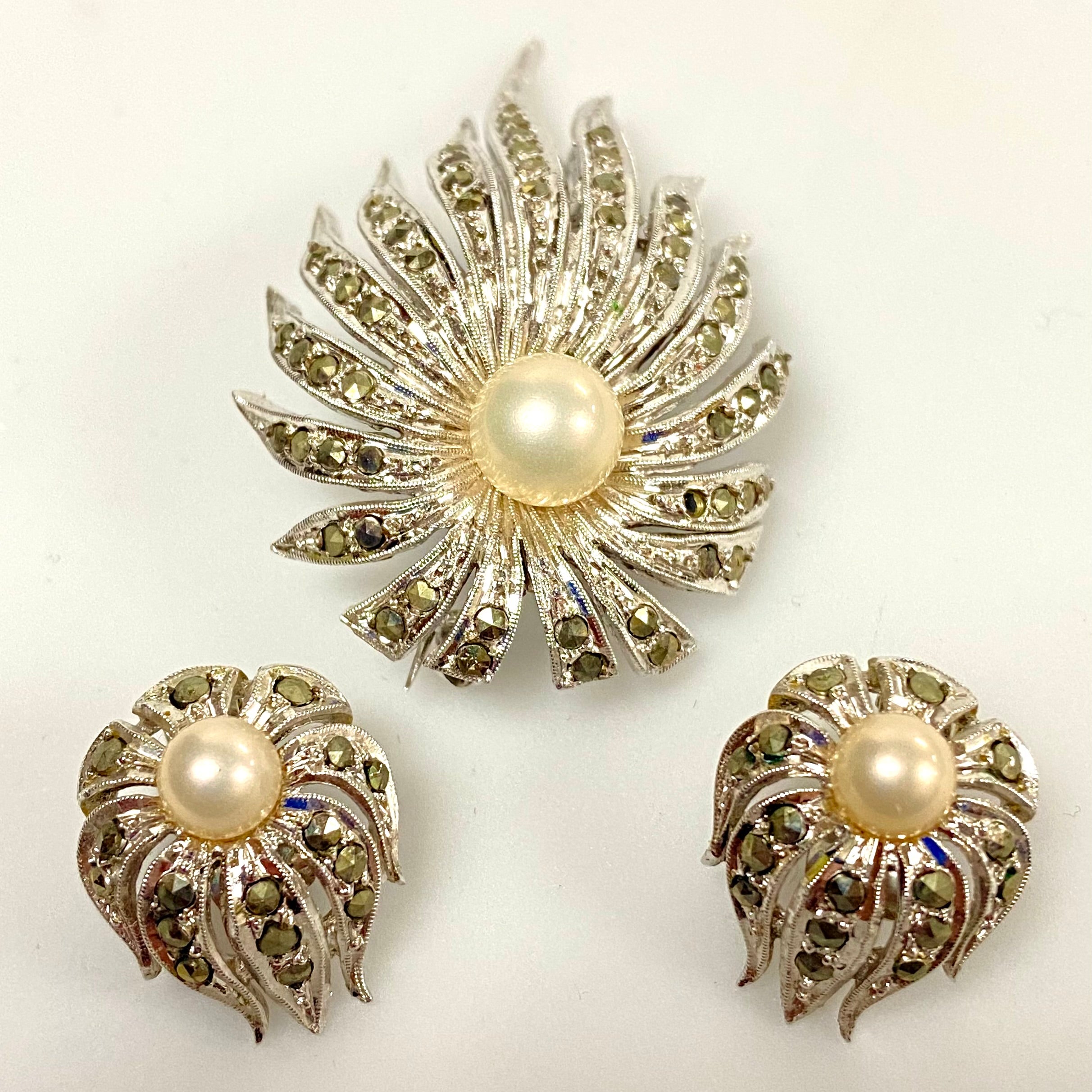 u834 Vintage 3pc Set Clip Floral Earrings & Matching Brooch Pin Pearl Marcasite