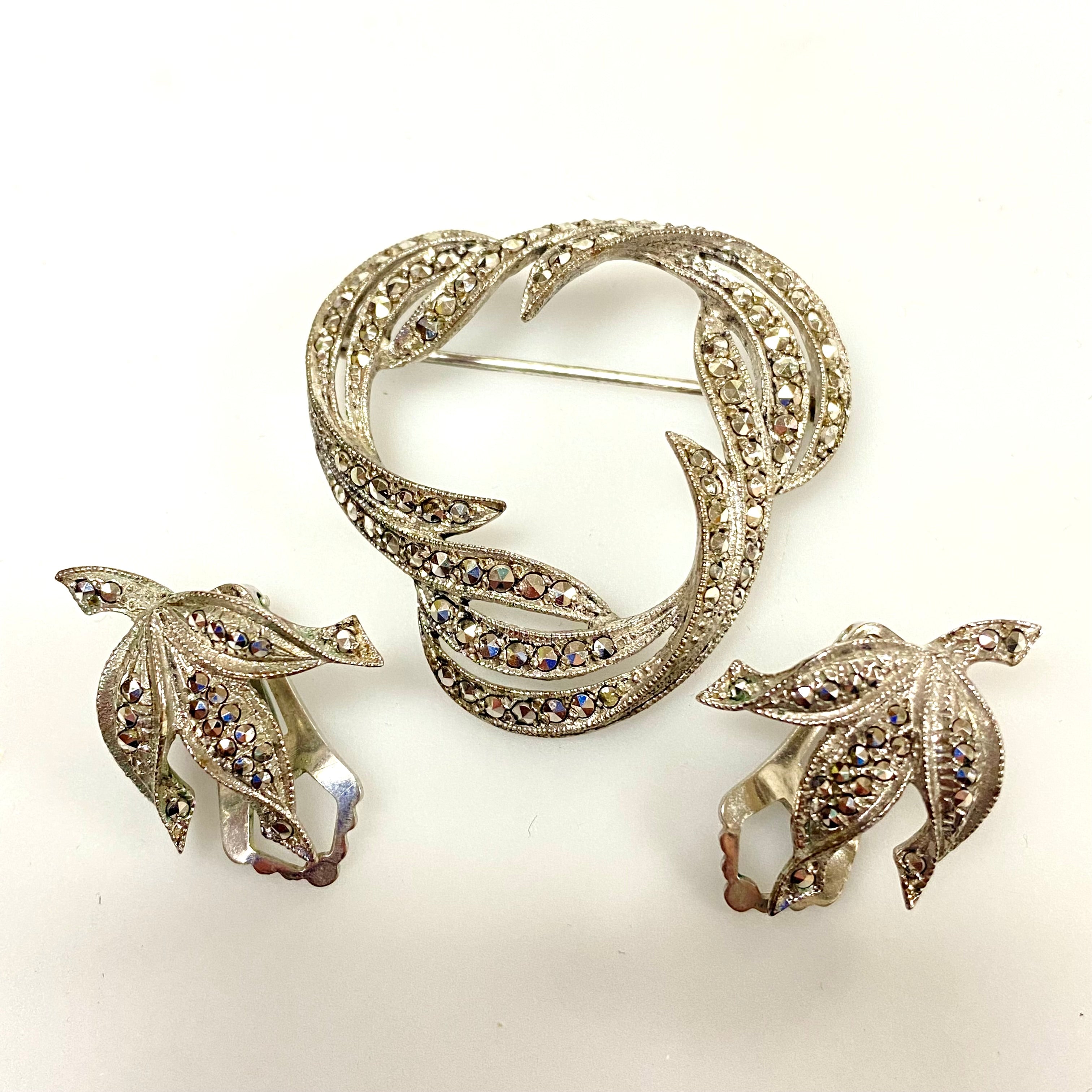 u835 Vintage 3pc Set Clip Floral Earrings & Matching Brooch Pin Marcasite