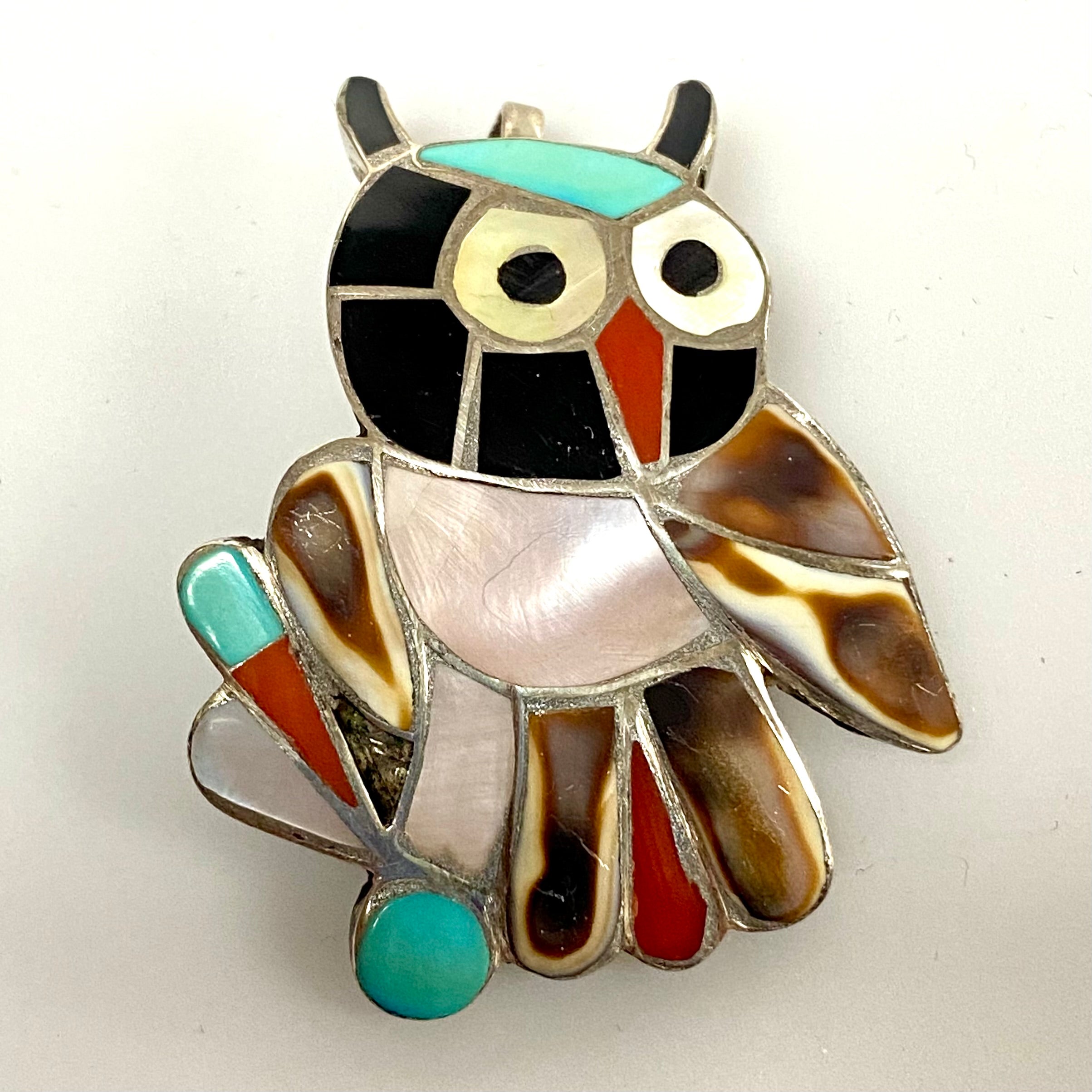 u836 Vintage Esalio Zuni Owl Pendant Pin Brooch Sterling Silver Turquoise Shell