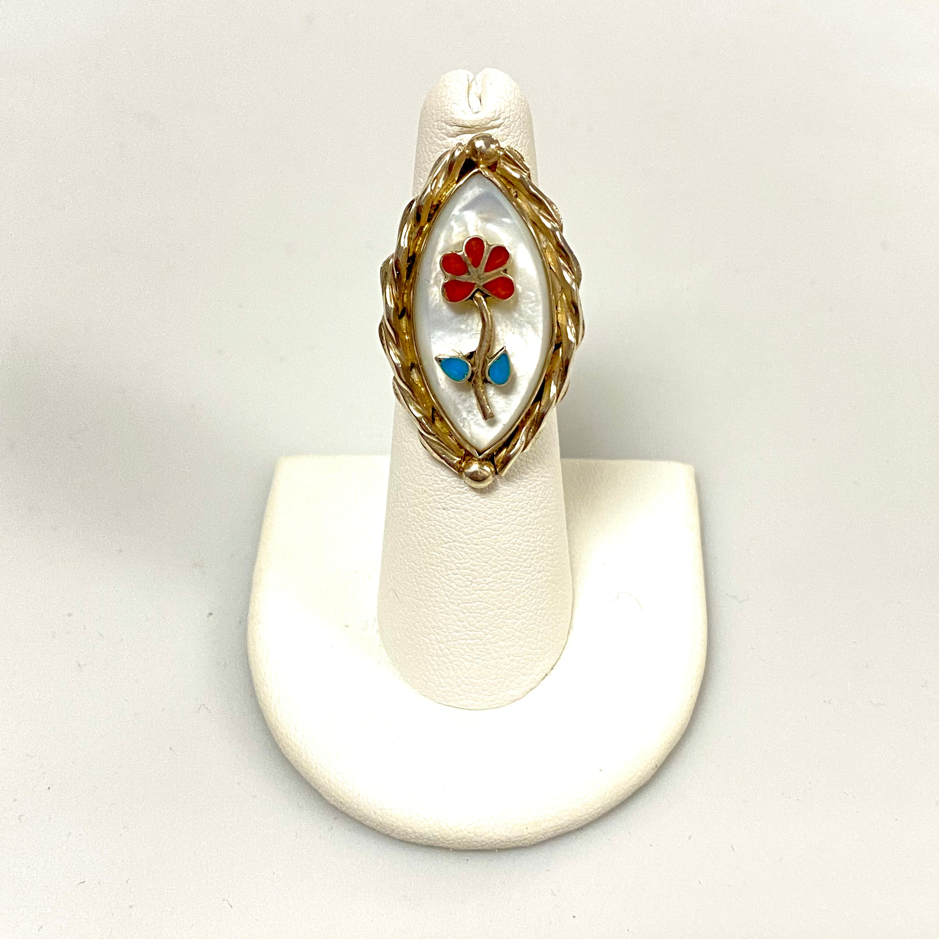 u838 Vintage Zuni Mother of Pearl Inlay Stones Sterling Silver Ring Size 4 3/4