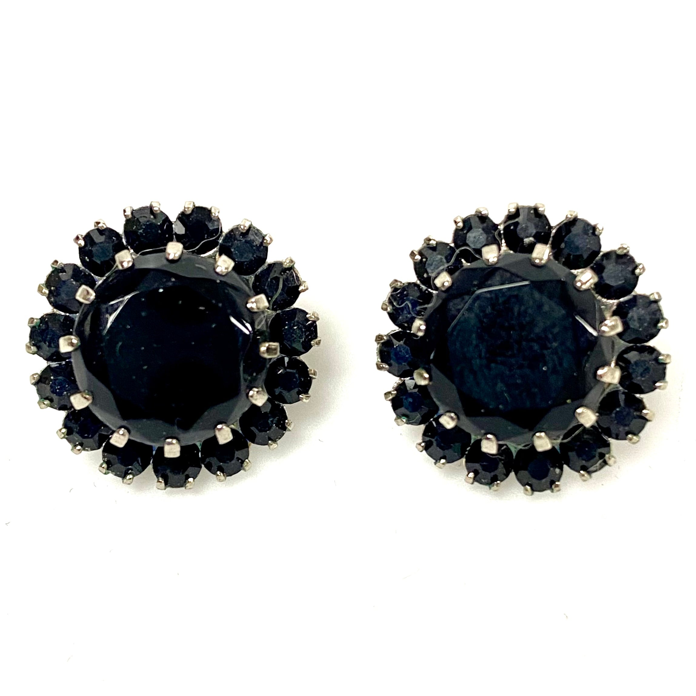 u856 Vintage 2pc Clip-on Earrings Set Silver Tone Black Stones Flower Shape