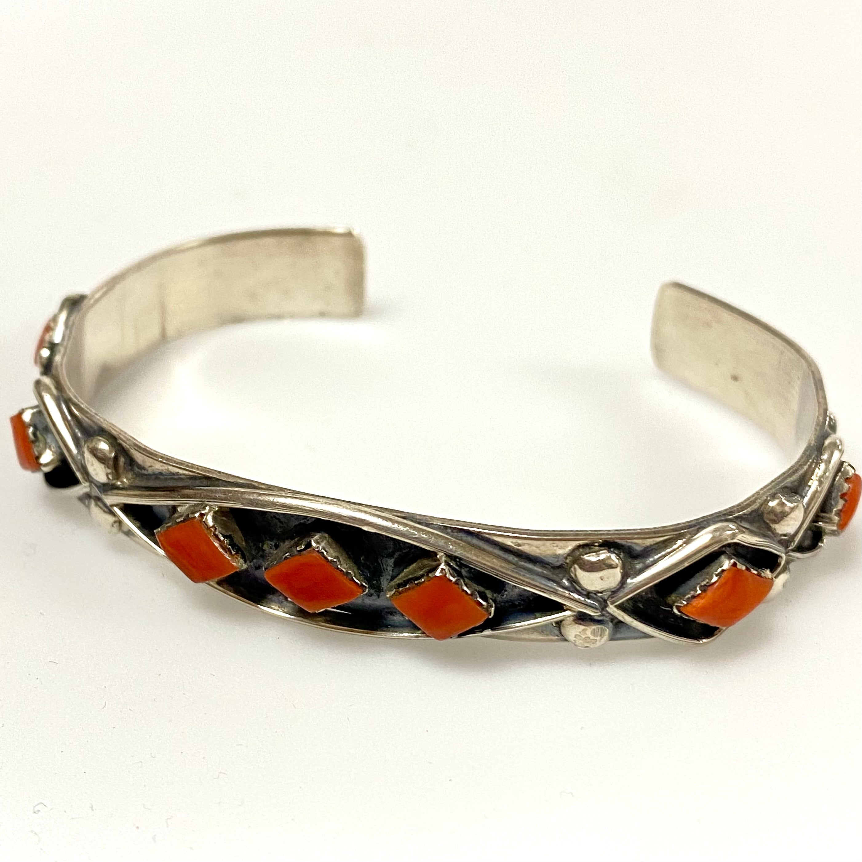 u857 Vintage Zuni Cuff Bracelet Carved Inlaid Orange Coral Sterling Signed REXX