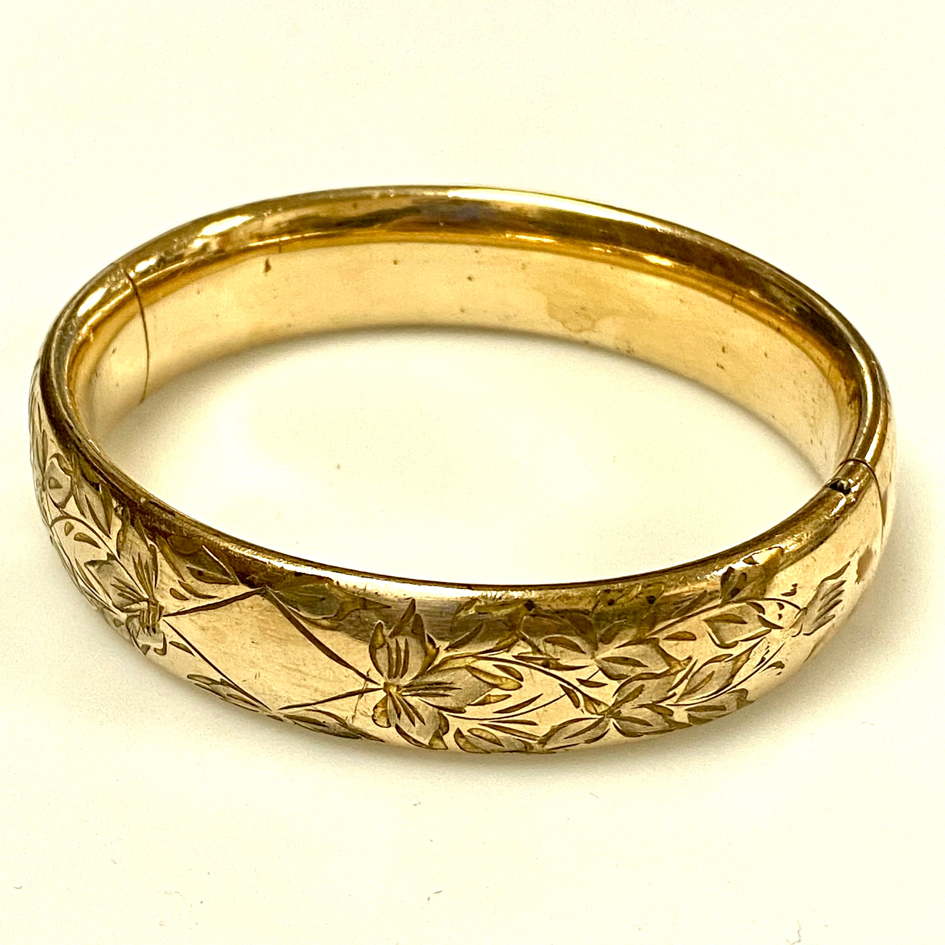 u870 Vintage Gold Filled Hinged Carved Floral Bangle Bracelet