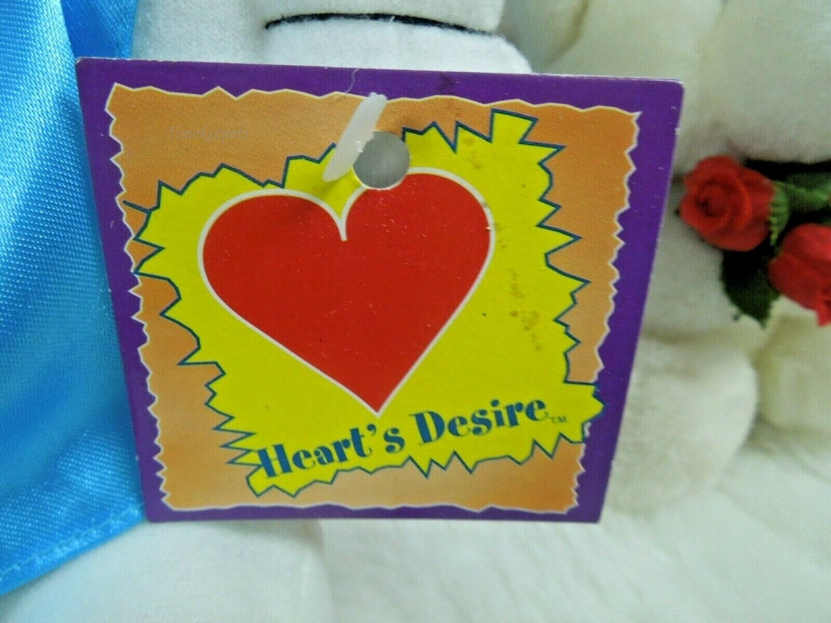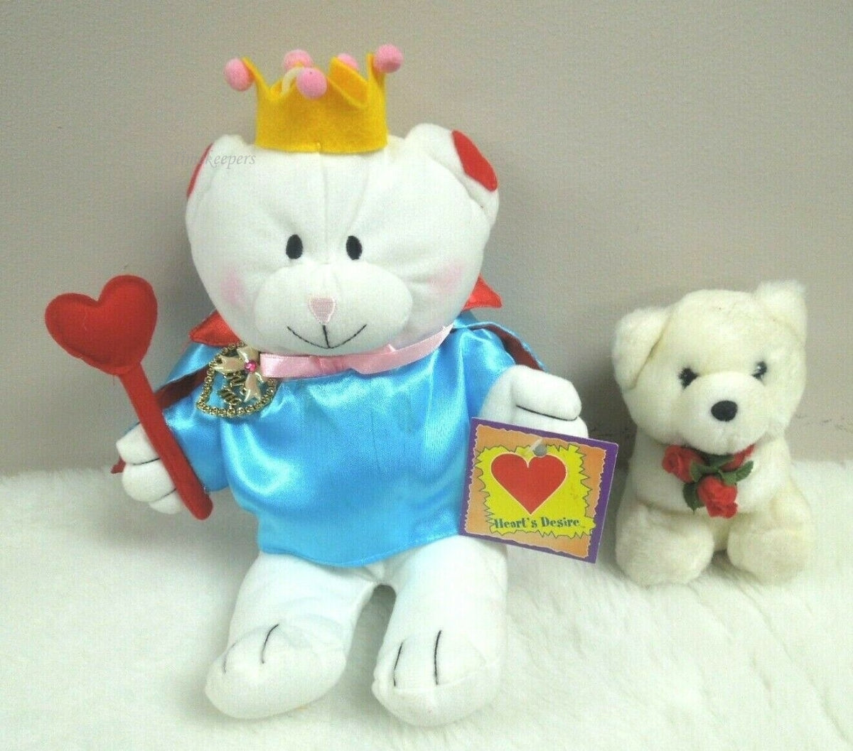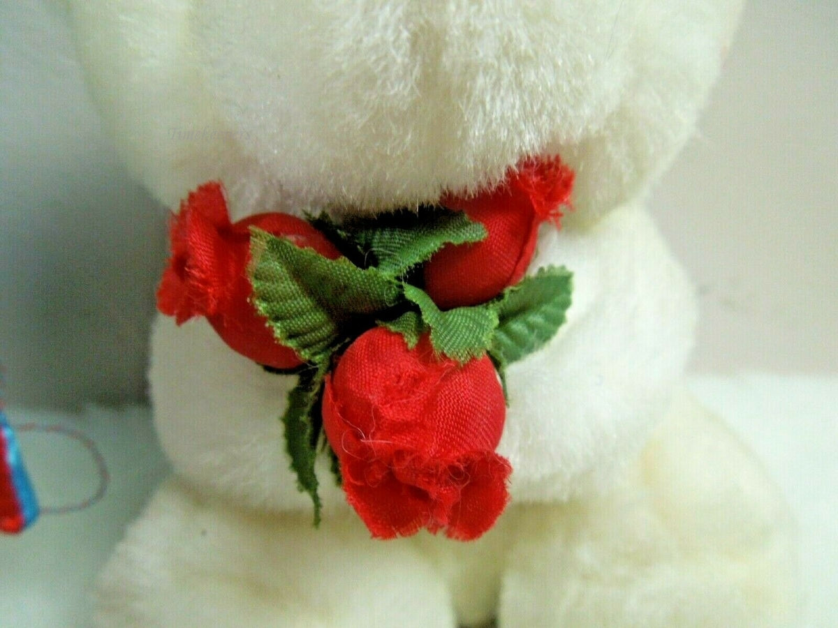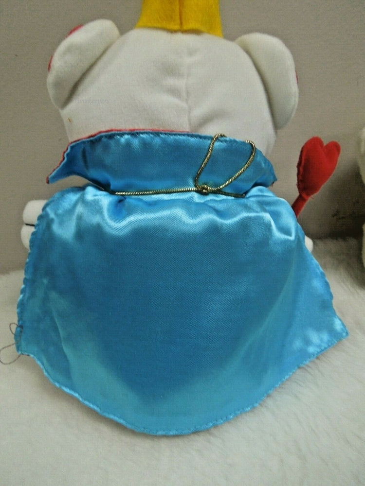 Vintage Pair of Cute Teddy Bears Plush Toy Rare Stuffed Toy. The bear with blue blouse and cape is 9" in height and it is in sitting position, has still tags on it. The other small beige bear holding 3 red roses is 5" in height and it is also in great condition
