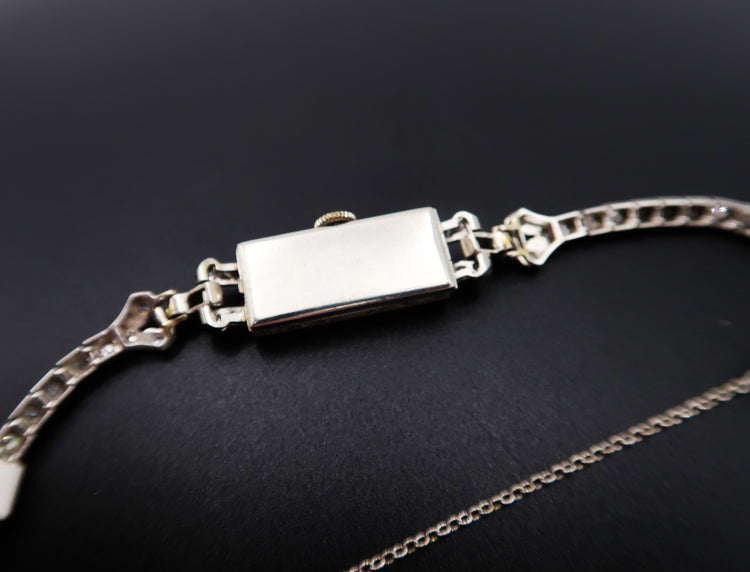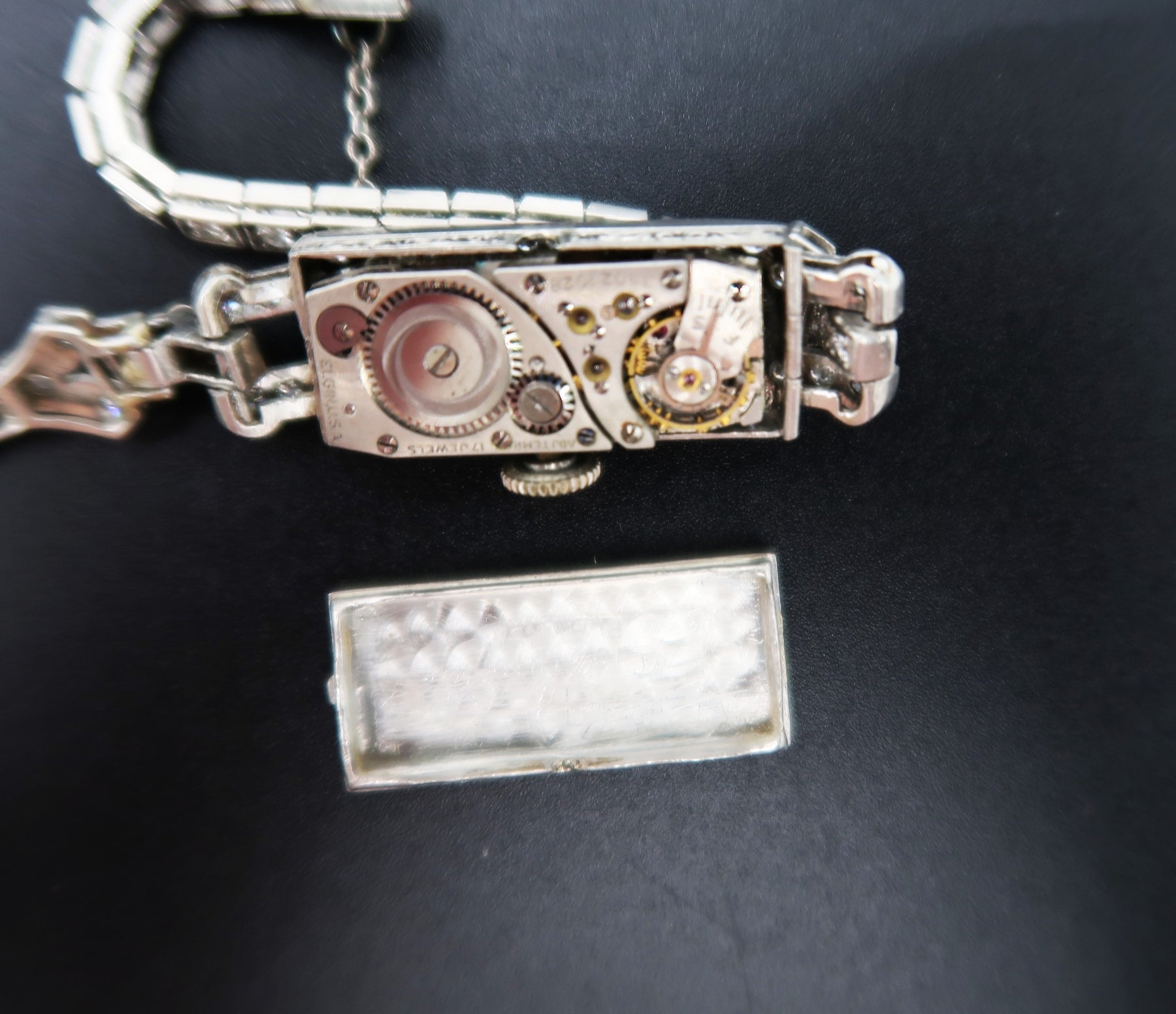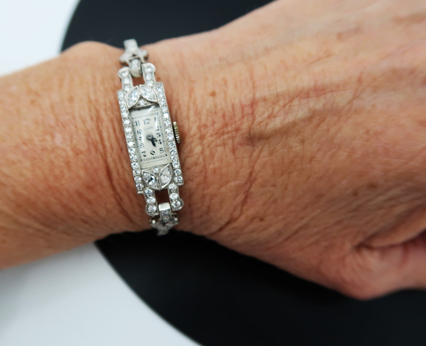 This is a beautiful Elgin ladies diamond bracelet wristwatch. The case is Platinum with diamonds along with the band and double fold over clasp. It will fit a wrist from 6 1/2" on down. The band and the case are all adorned with diamonds.