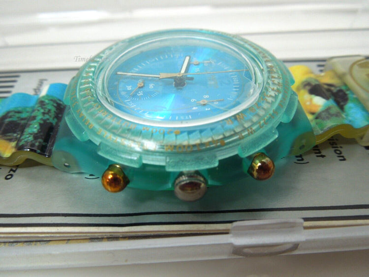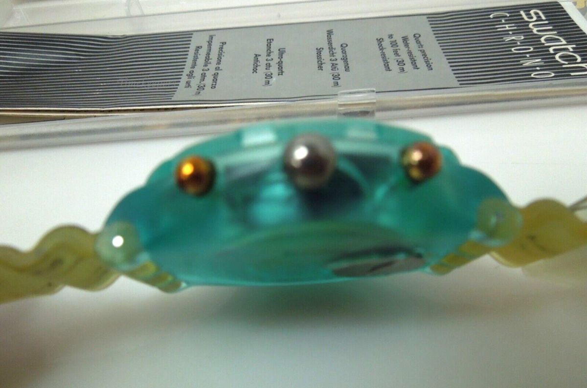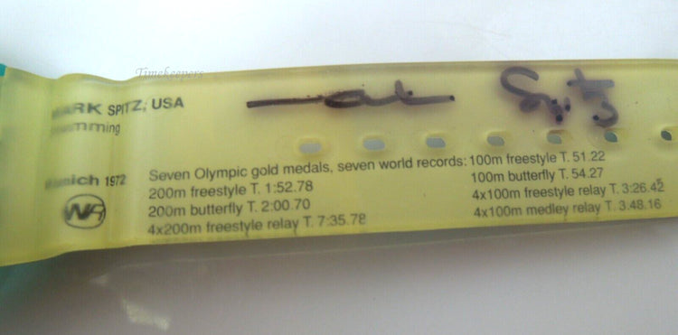This is a fabulous tribute swatch watch in honor of Mark Spitz the olympic champion WR holder for swimming. This swatch has never been worn it is an aquachrono and has a 7 on the face for the 7 gold medals that he won. It is in working condition with a new battery. It has Mark Spitz’ information about his olympic records on the back of the band including an american flag and his signature within the band. A great vintage swatch watch for the aspiring athlete or swimmer.