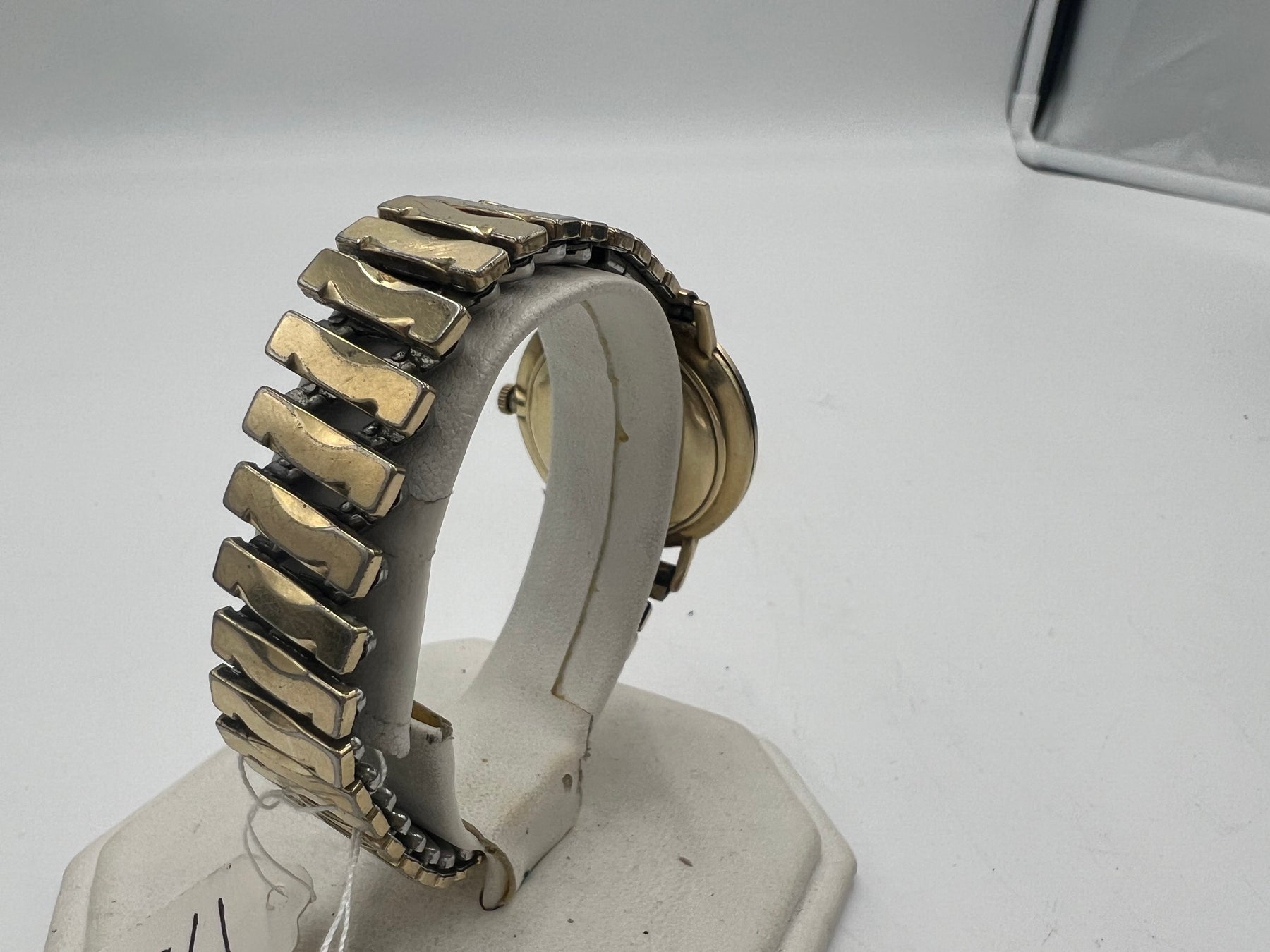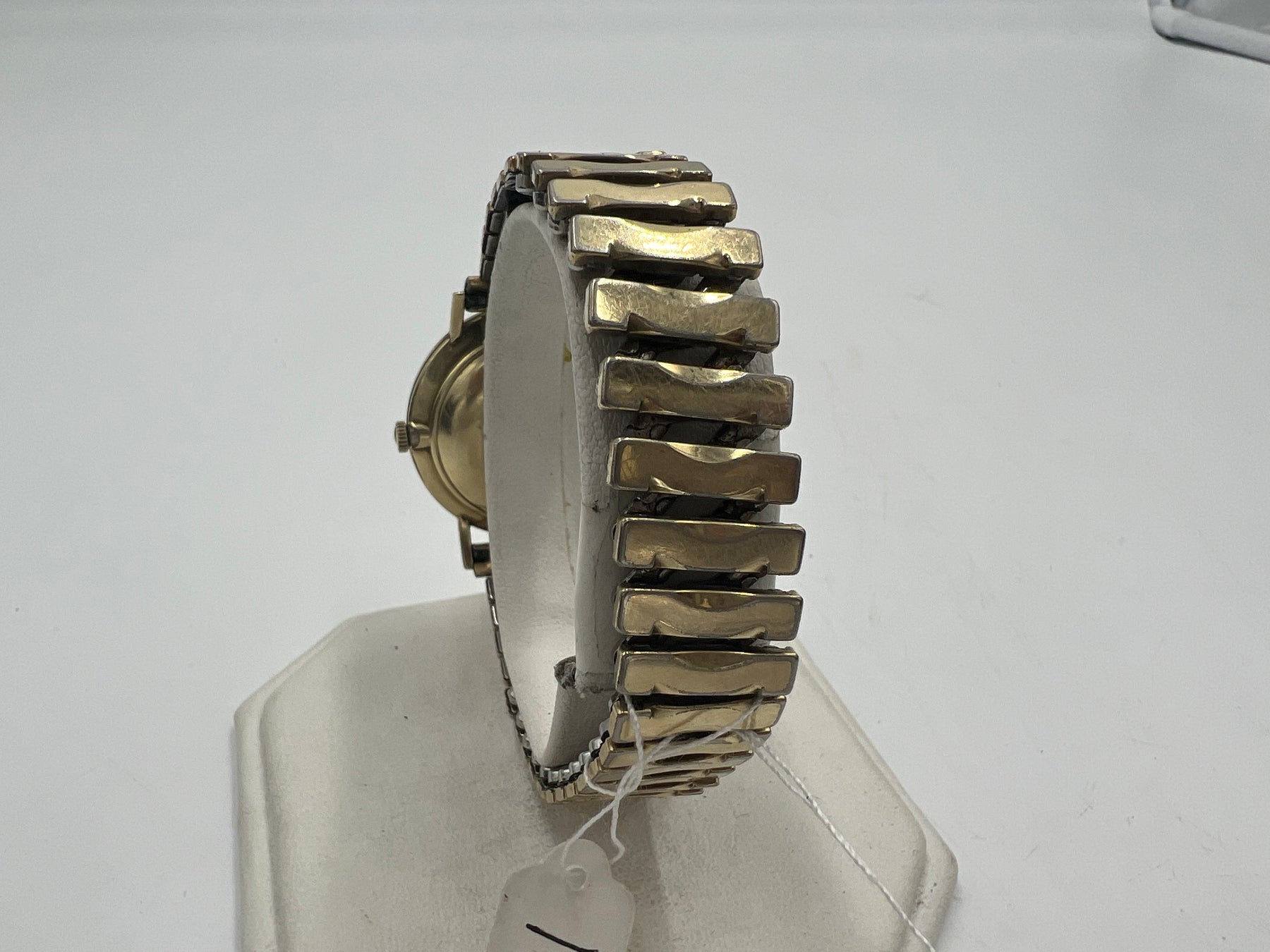 Specifics: 30mm case diameter with a band width of 15mm. Stretch band is stainless steel with a gold tone and the case is 14kt gold filled. There is a faint inscription on the back of the case.