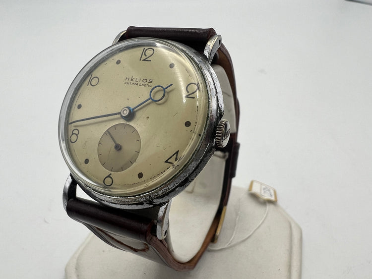 This Helios wristwatch from the 1950s features a manual wind movement and a small seconds function. It has an antimagnetic mechanism and is perfect for men looking for a dress or formal style watch. The brand is known for its quality and this model does not disappoint. It is a great addition to any watch collection and can be worn for any occasion.
