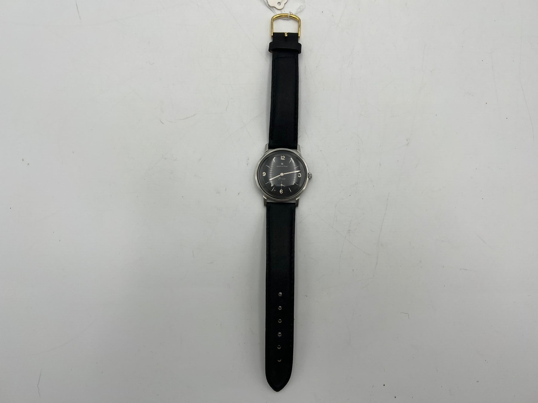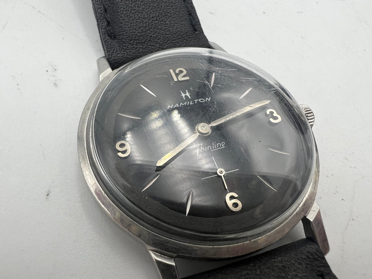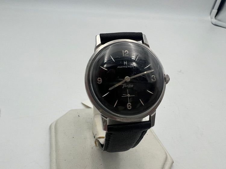 This Hamilton Thinomatic wristwatch from the 1950s exudes timeless elegance. With its mechanical manual winding movement, it offers reliable precision for any occasion. The black dial adds a touch of sophistication, while the small second feature adds practicality. This watch is suitable for both formal and casual settings, making it a versatile addition to any collection.