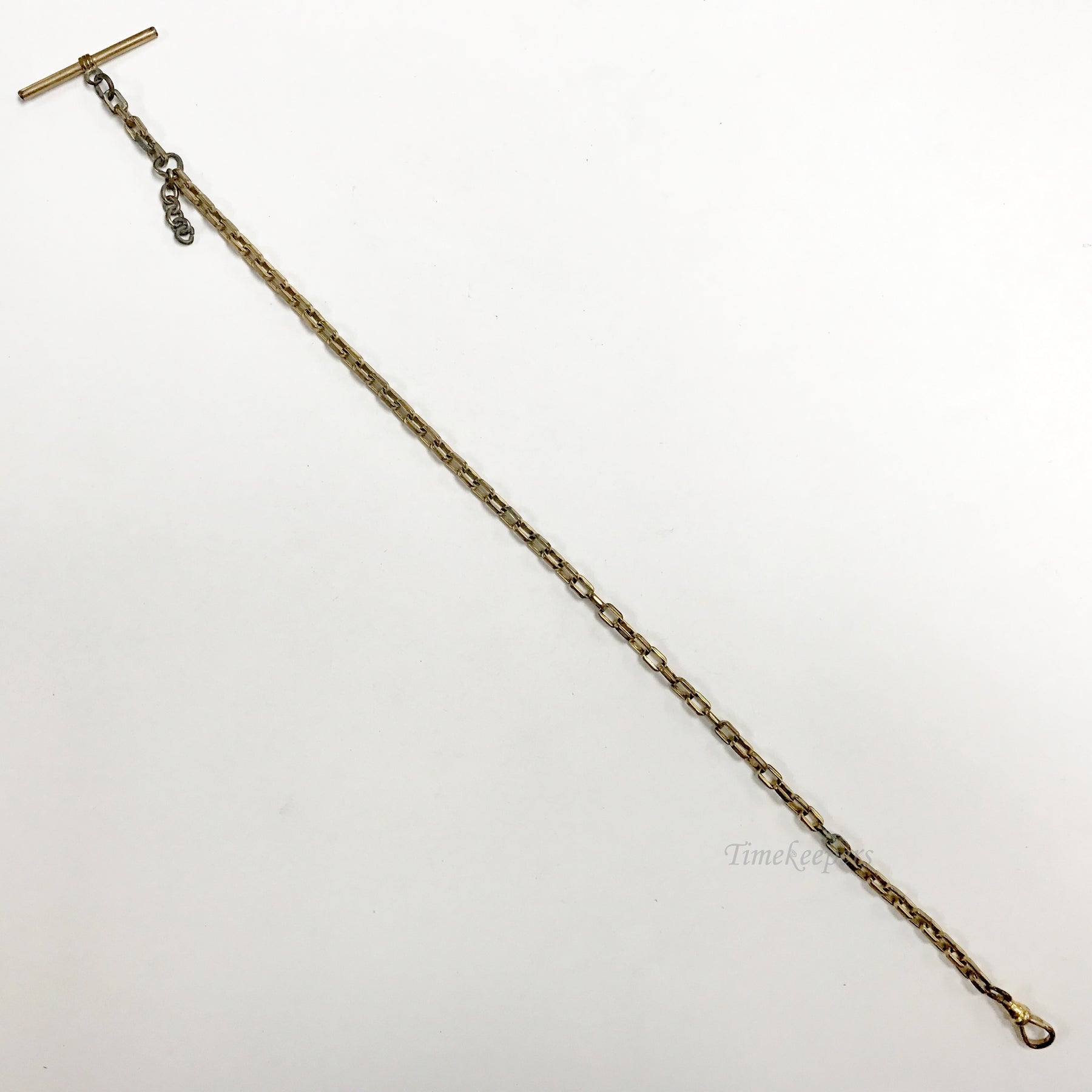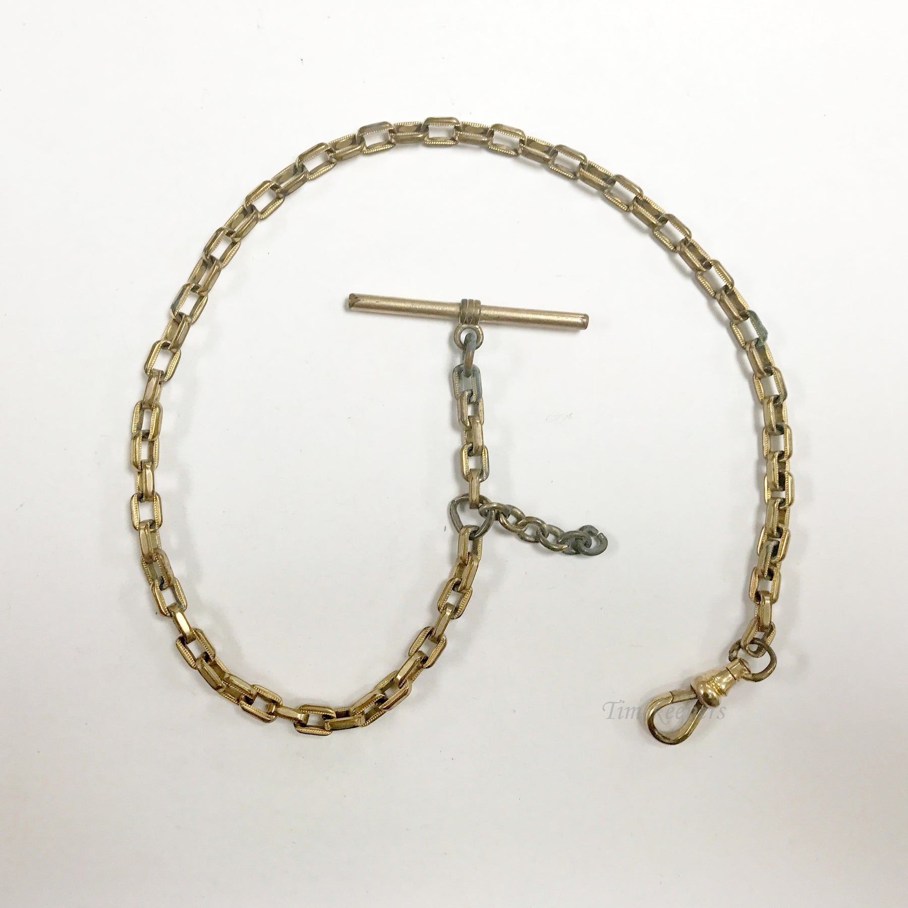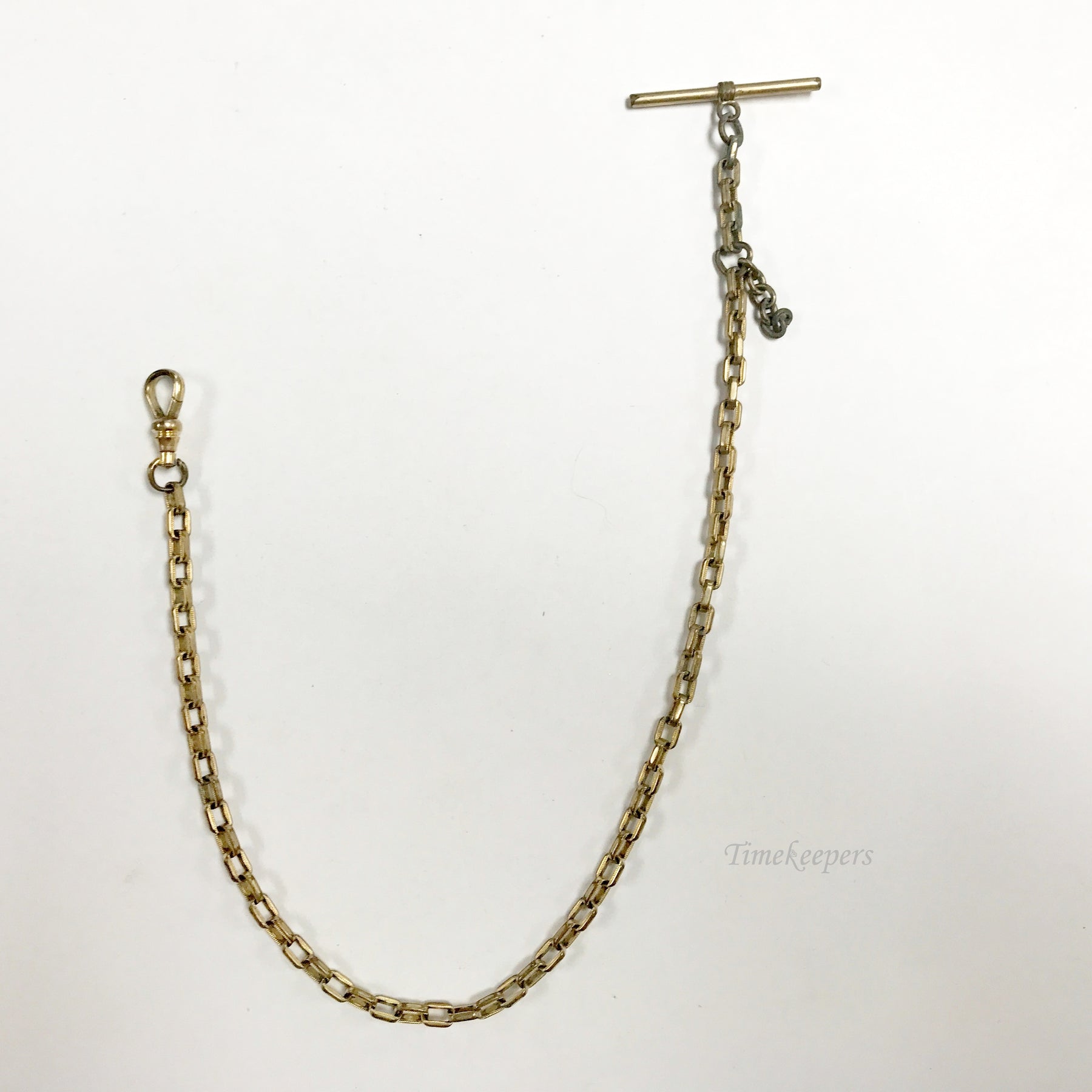 - Antique Pocket Watch Vest Chain. Gold filled. Button bar, spring clasp, wide links.
