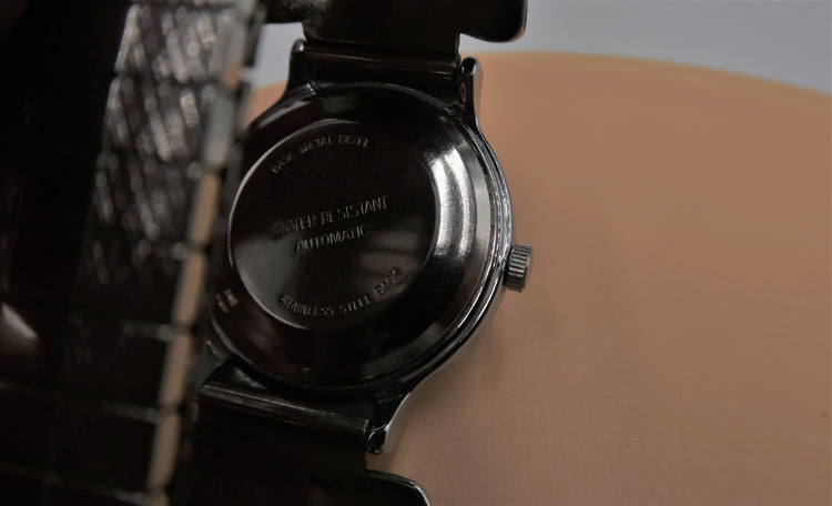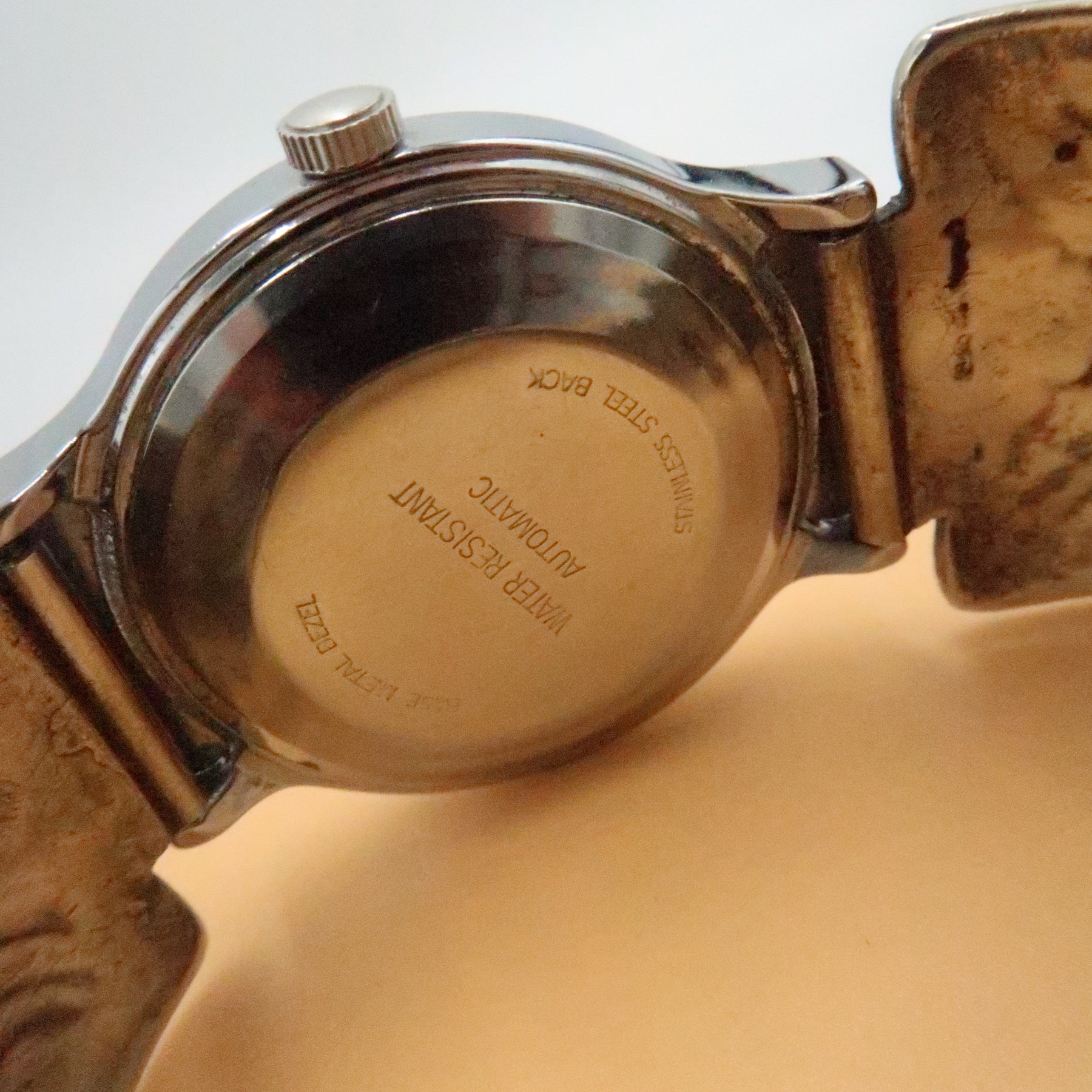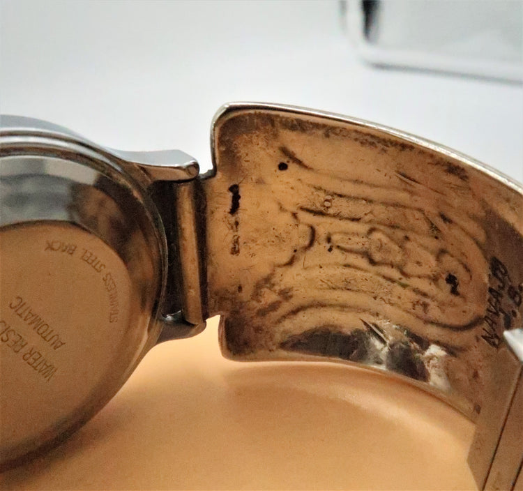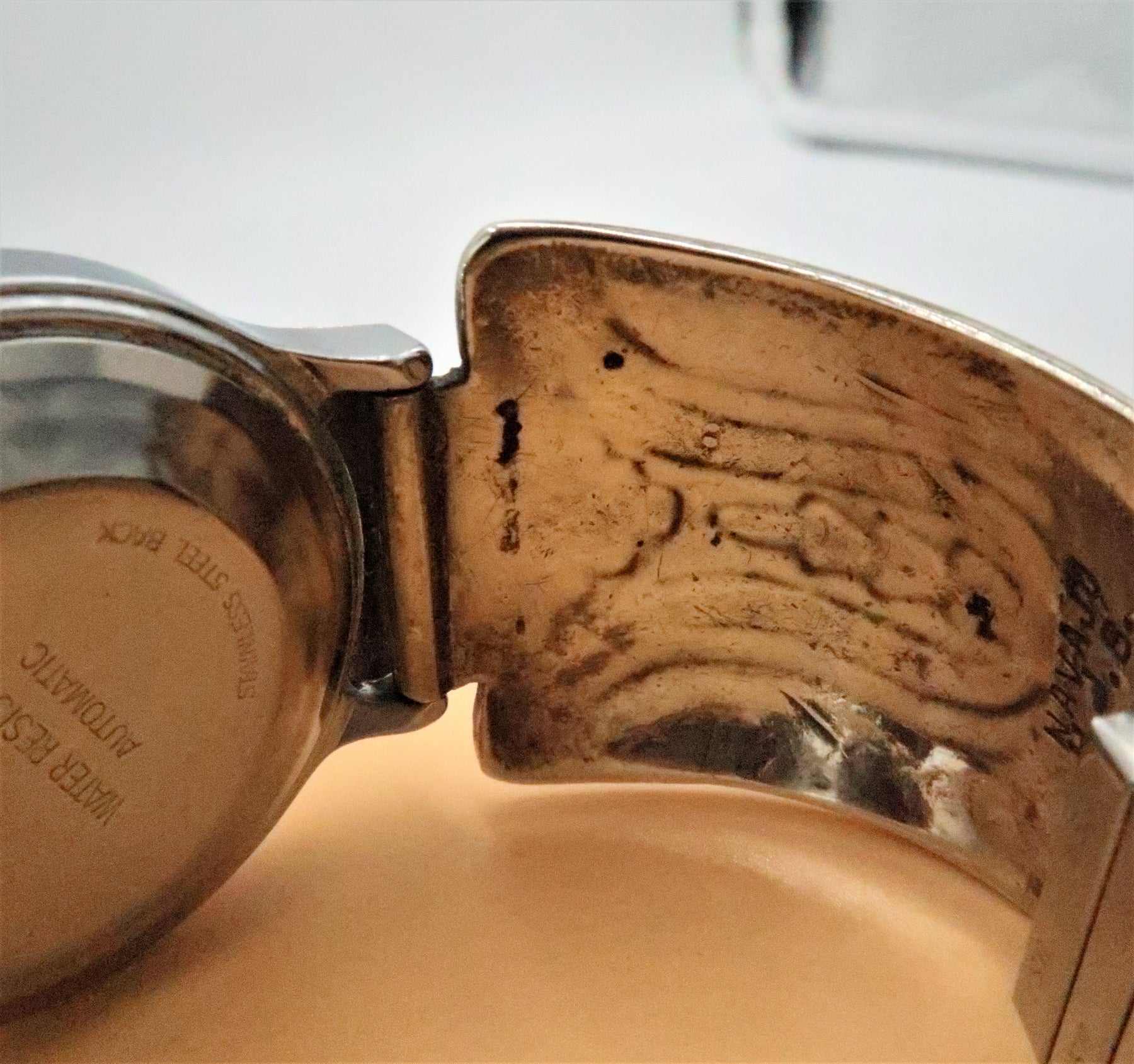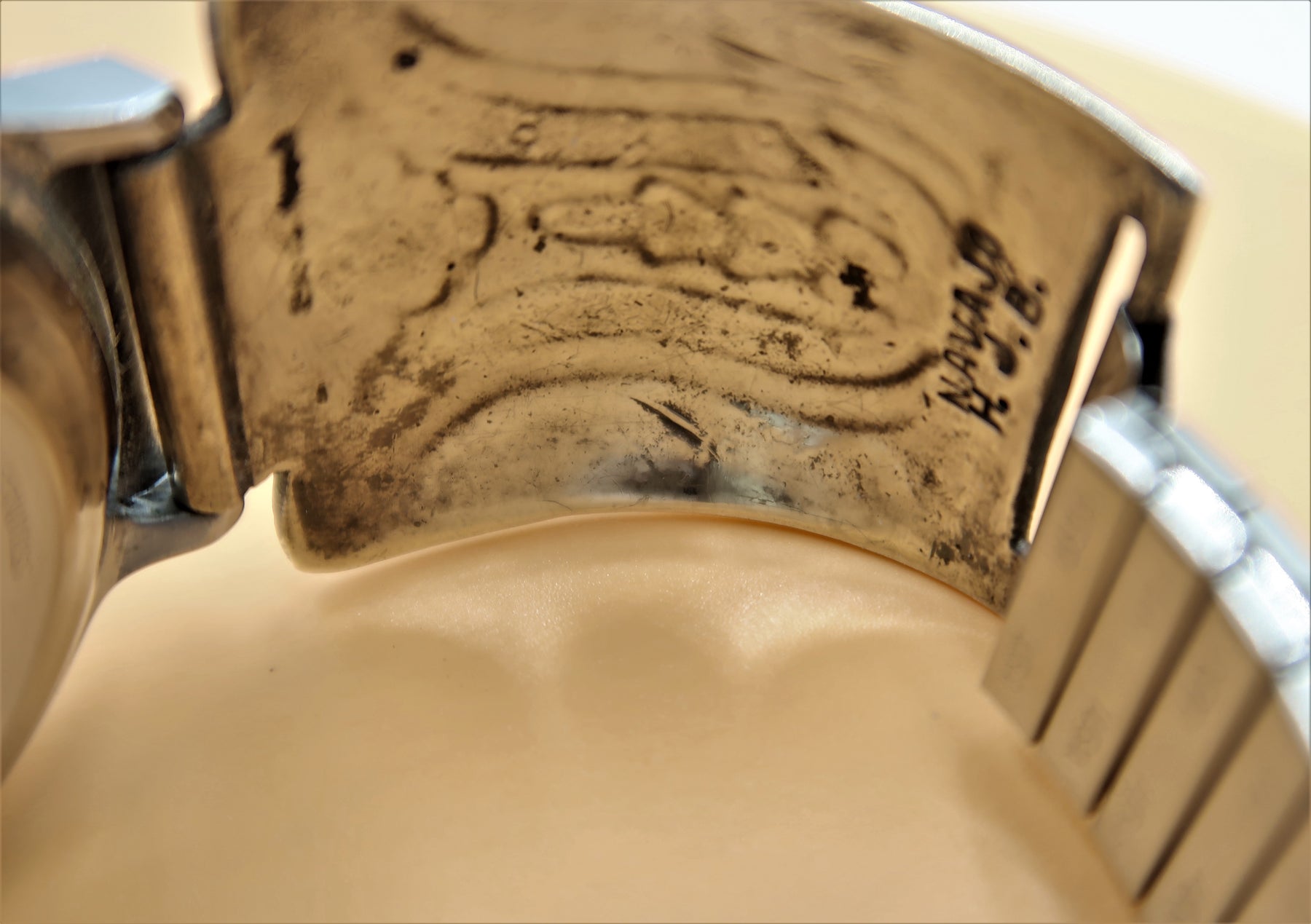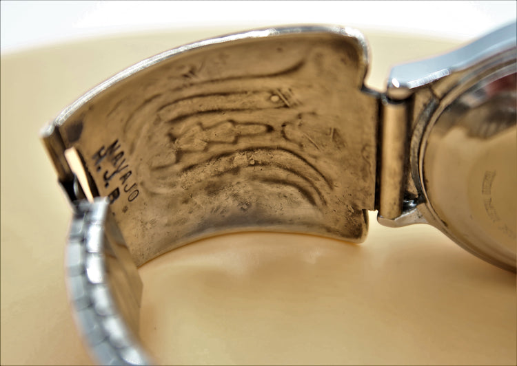 Nice sterling silver watch band with inlay turquoise chips and a Timex automatic watch.  The inside of the band is stamped NH.J.B.  The middle section of the band is a stainless steel stretch band.  The Timex watch is automatic with the date and a blue dial.