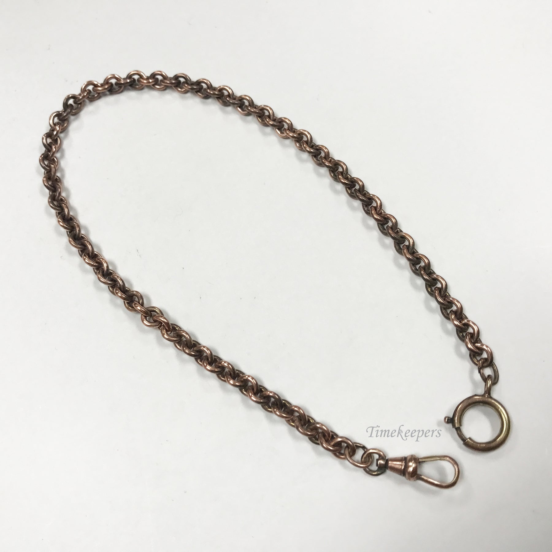 This pocket watch chain is 12" long. The chain is in good cosmetic condition for it's age. It has light wear, and light discoloration from being lightly used and aging. This chain is in copper with a gold tone spring clasp.