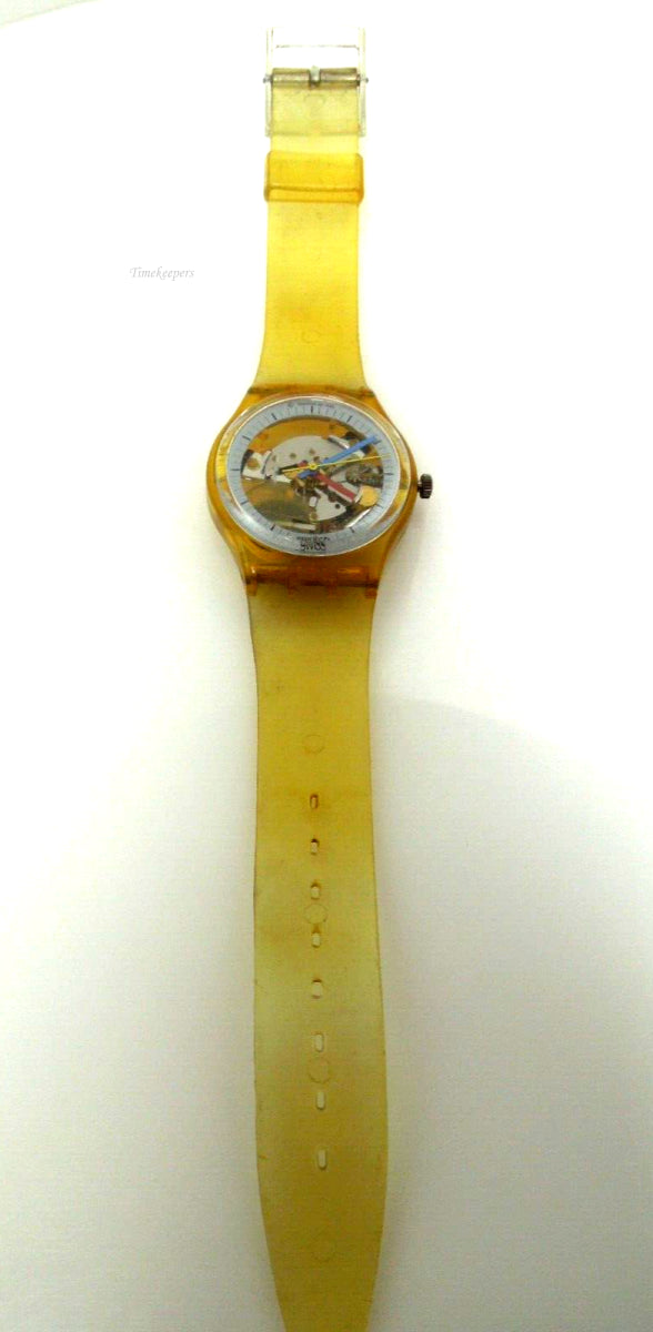 This is a rare, vintage Swatch Watch known as Golden Jelly Skin from the 1998 Fall Winter Collection. It is in vintage condition, but there is a very small crack to the crystal. The watch diameter is 34mm