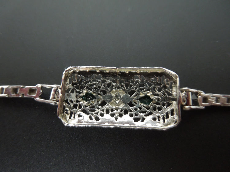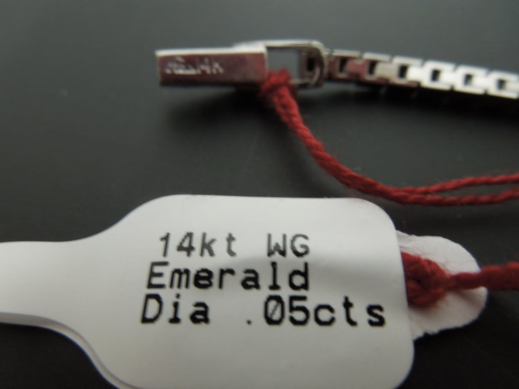 This is a lovely elegant vintage bracelet in 14kt white gold. It is a tennis style bracelet with a delicate filigreed piece in the middle with 2 emeralds and a diamond. The bracelet measures 5 1/4" in length, so it is on the small size.